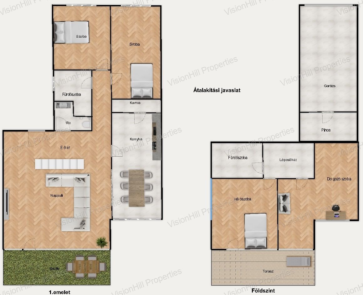 Alsó szint (42 m²): másfél szoba, konyha, fürdőszoba WC-vel és terasz közvetlen kertkapcsolattal.