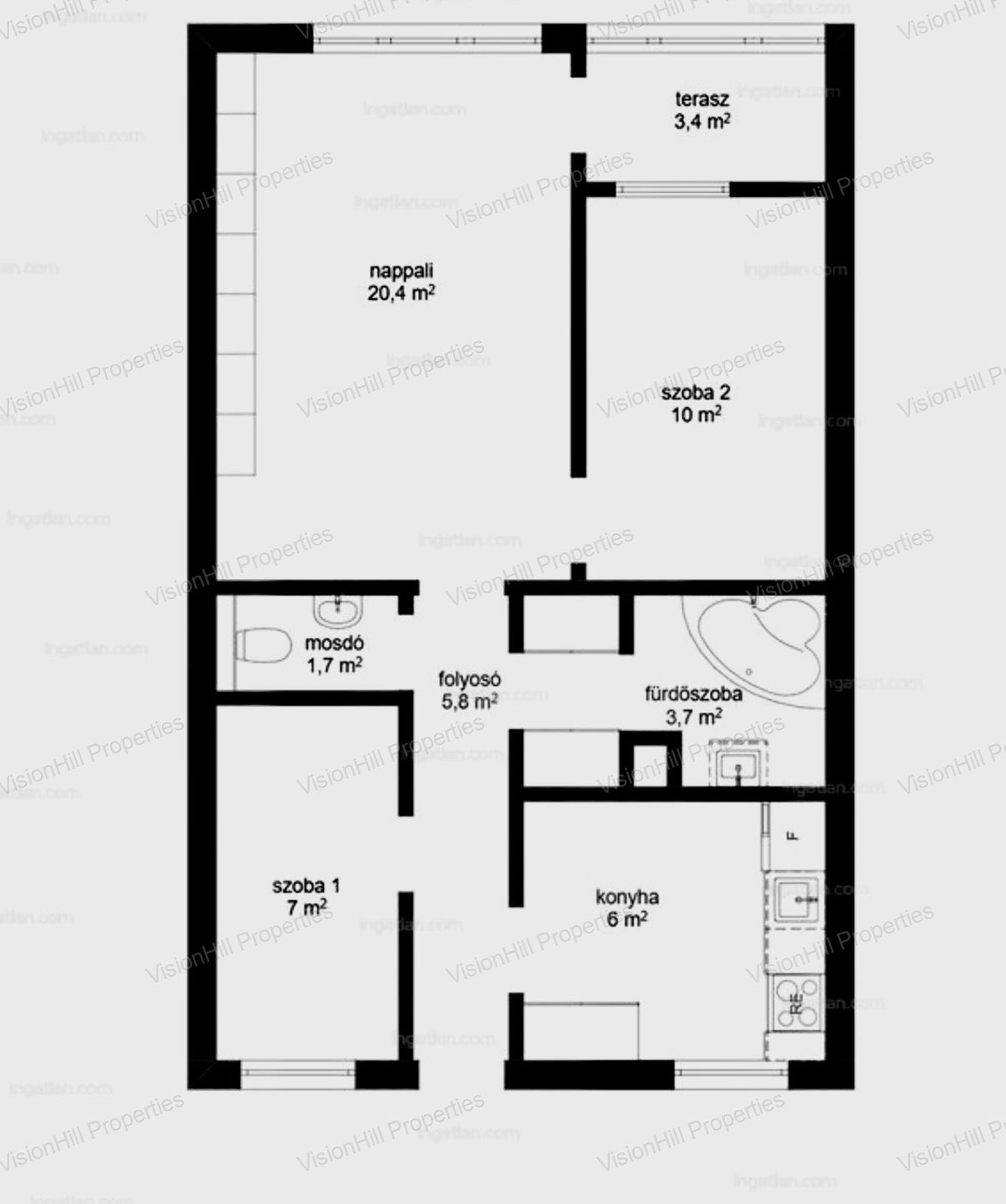 Az ingatlan tulajdoni lap szerint 55 m2 . Az öt emeletes épület fél emeletén helyezkedik el az ingatlan.Elrendezés szemponjából jelenleg az ingatlan nappaliból , 2 hálószobaából, beépitett erkéyből,fürdőszobából és wcből áll az ingatlan. Délnyugati fekvésű , így rendkívül világos. A fürdőszoba elmúlt években lett felújítva. A múltban is hosszú távú kiadásra tökéletes befektetés volt.