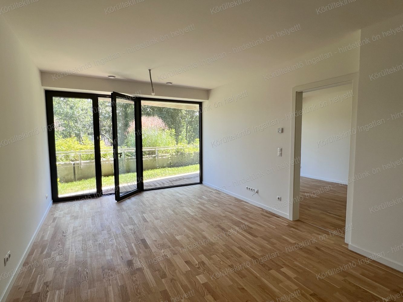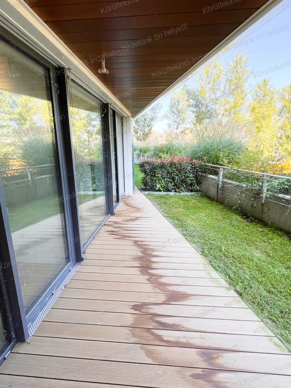 A lakás az épület keleti oldalán és egyben a legcsendesebb részén helyezkedik el, a kertkapcsolat révén bruttó 74 m2 területű életteret biztosít: