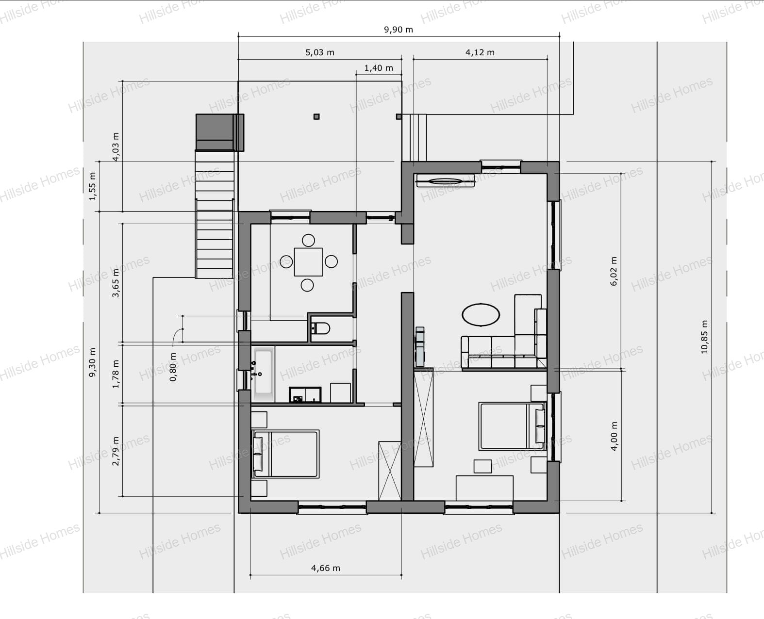 Elrendezés: tágas előszoba, világos nappali, konyha-étkező, 2 hálószoba, 1 fürdőszoba és 1 külön WC. A ~30 m²-es nagy terasz igazi kültéri nappaliként szolgál reggeli kávézáshoz, pihenéshez vagy családi grillezéshez, közvetlen kertkapcsolattal.