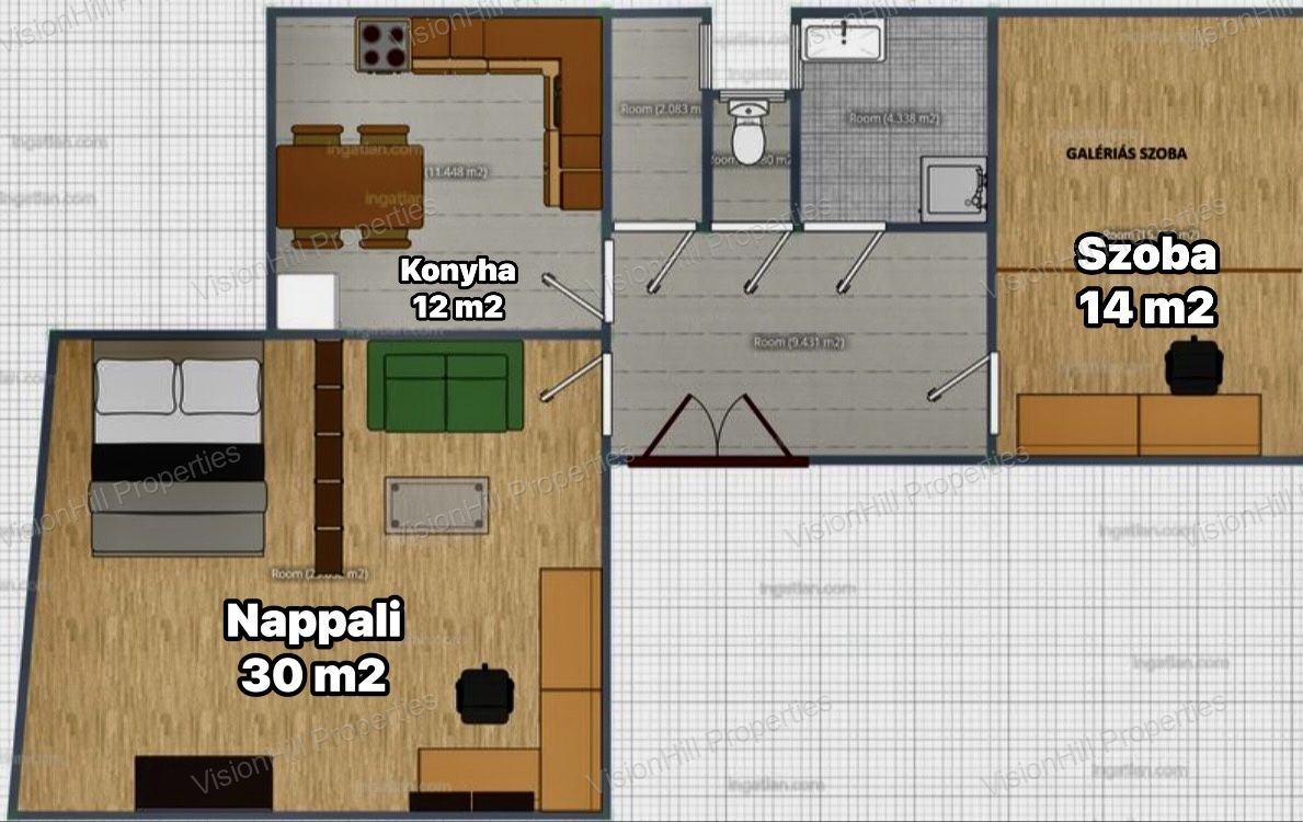A déli tájolású lakás tulajdoni lap szerint is 73 négyzetméter. A lakás világos, jó elosztású: egy hálószobával ahol galéria is van, egy nappali, egy szeparált konyhával , fürdőszoba, egy WC rendelkezik és egy kamra . A szobák ablakai egy belső udvarra néznek. A lakás teljes körű műszaki és esztétikai felújításon esett át 2010-ben: új padlóburkolat, új gépesített konyhabútor, egyedi tervezésű beépített szekrények, külső és belső nyílászárók.