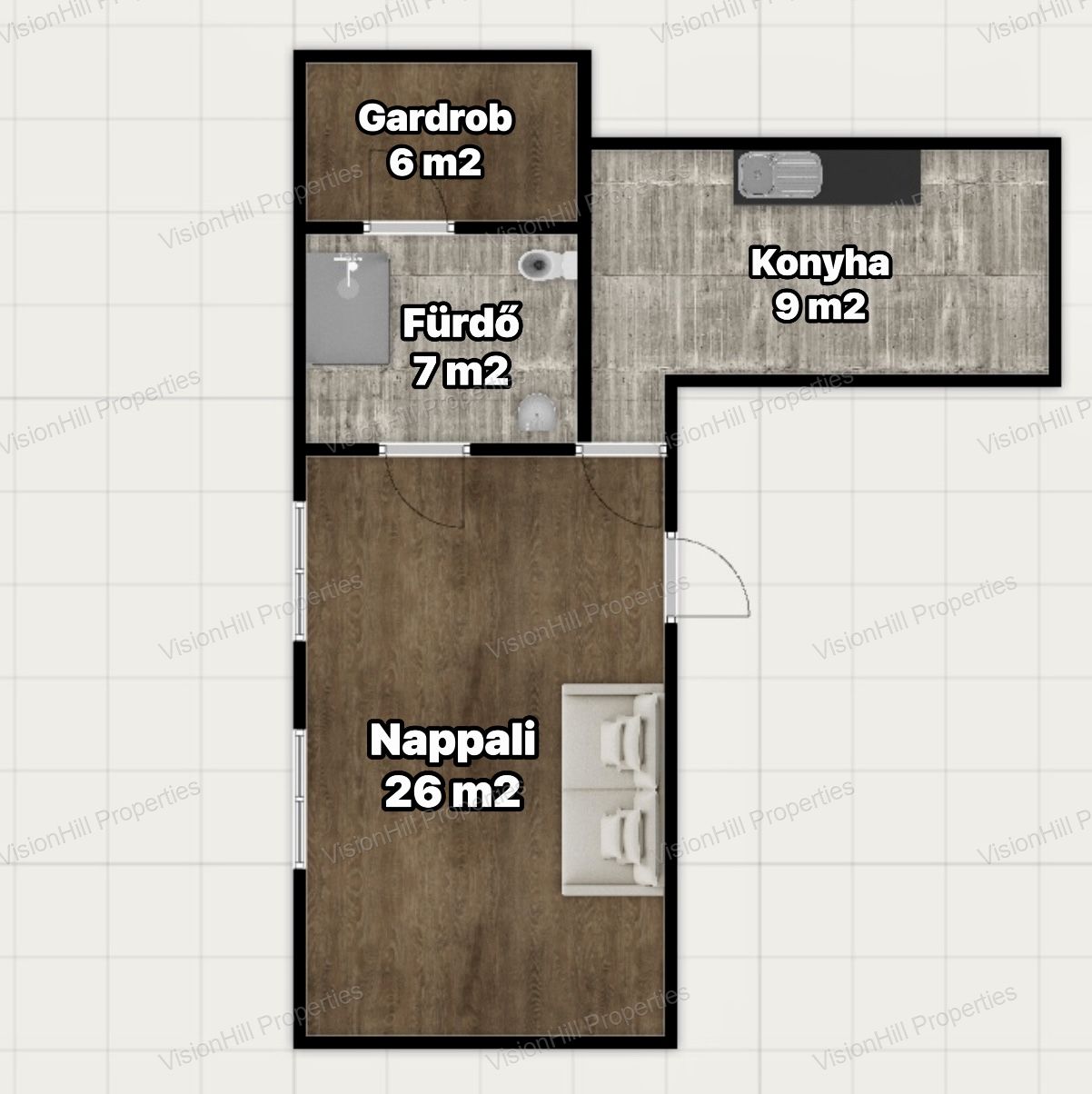 A 47 négyzetméteres ingatlan egy harmad részt foglal el egy gyönyörű villaépületben ezen a szinten. A teljes belső újragondolása egyedileg történt, beleértve a falak áthelyezését. Az otthonban található egy tágas nappali, egy fürdőszoba, egy gardrob és egy konyha. A fűtés kombinált módon lett megoldva, hűtő-fütő klima és gázfűtés is rendelkezésre áll.