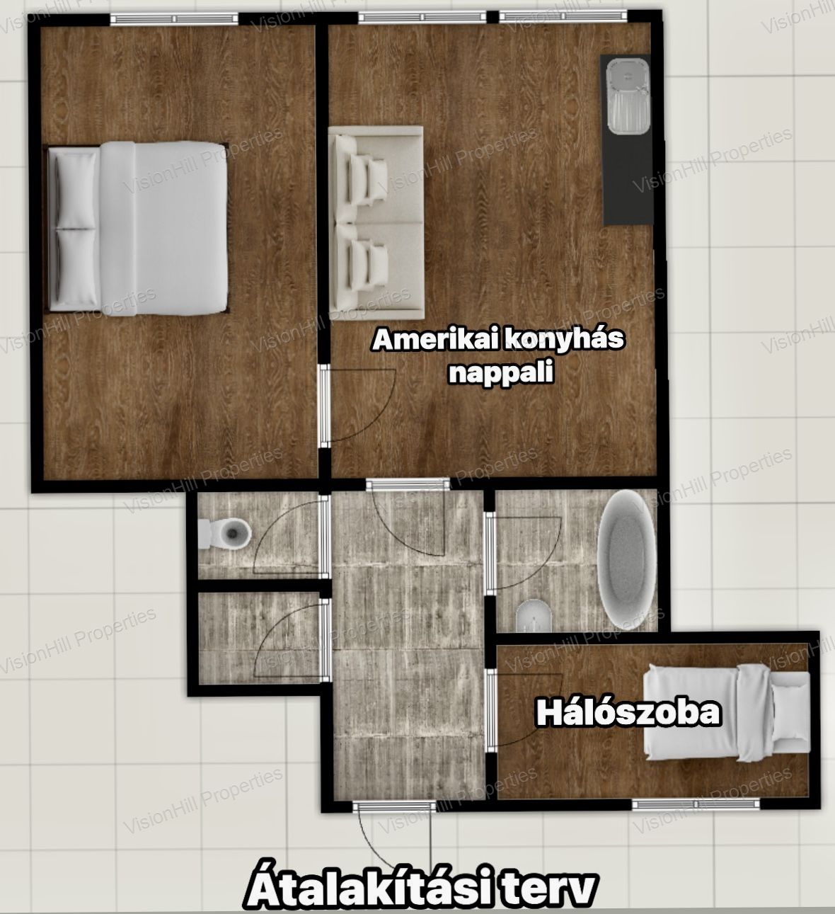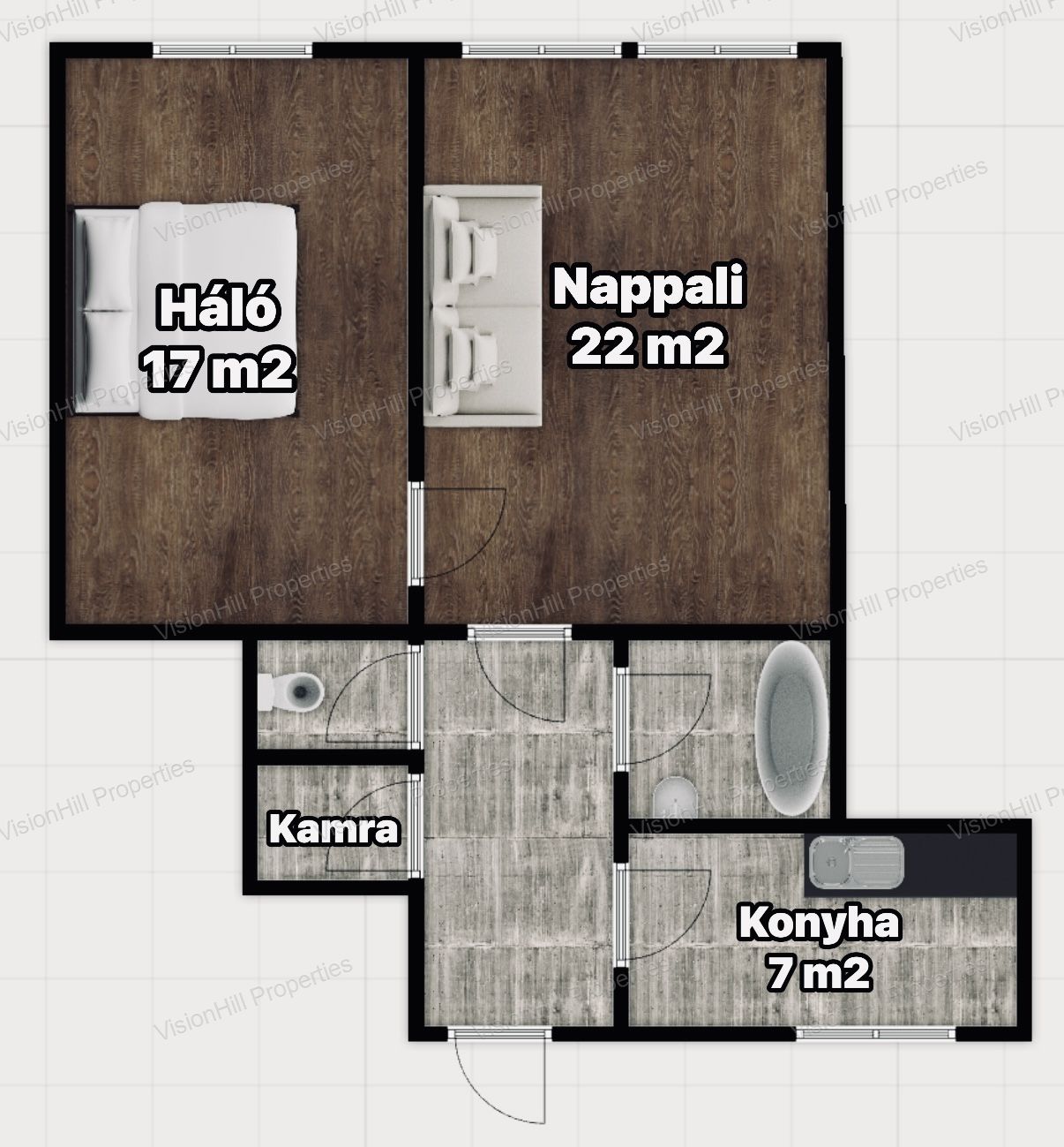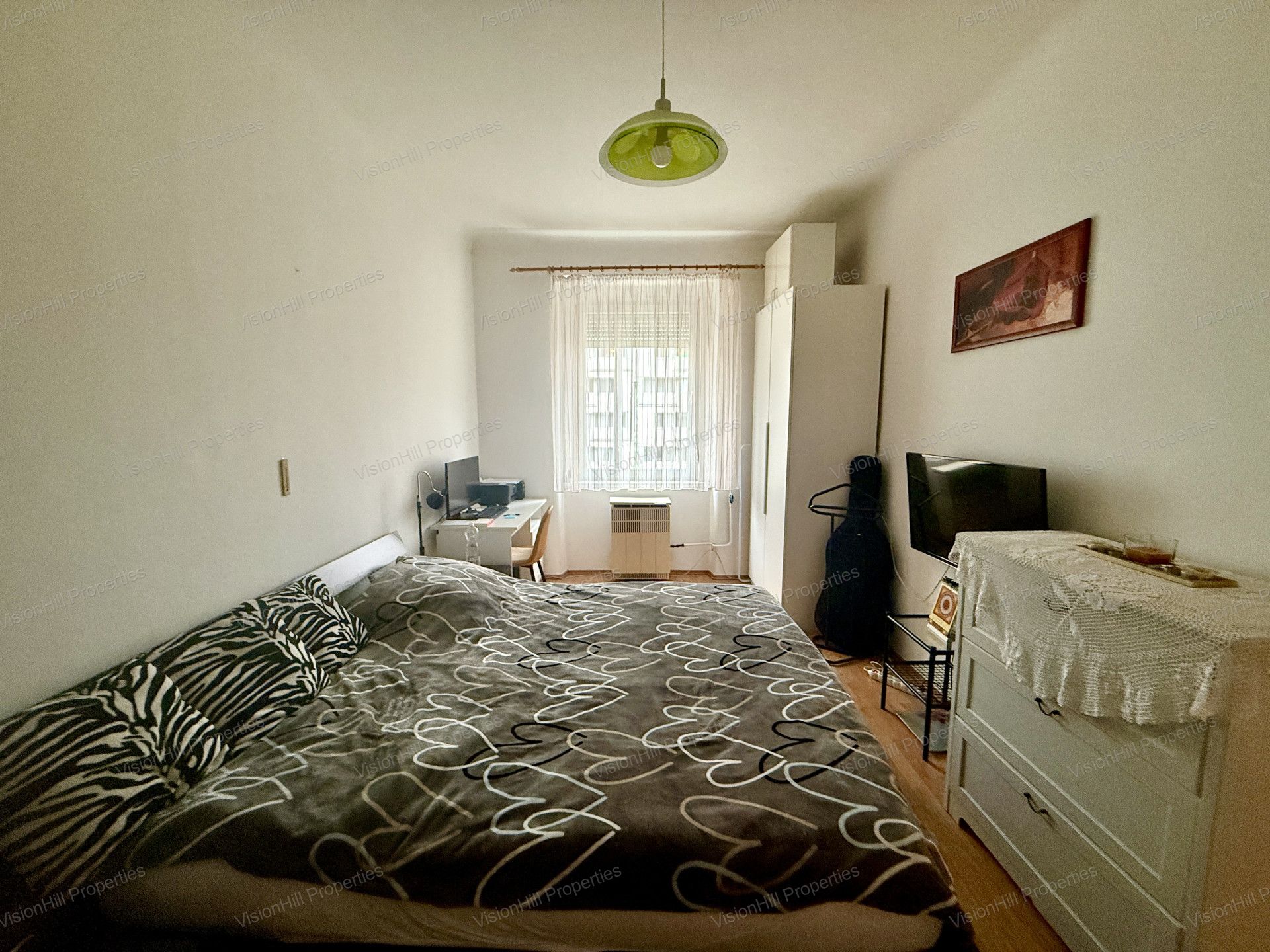 A nyugati tájolású lakás tulajdoni lap szerint is 59 négyzetméter. A lakás világos, jó elosztású: egy hálószoba , egy szeparált konyha ,amiből akár hálószbát is lehet csináni ,konyha egy előtér és egy kamra . A szobák ablakai a utcára néznek. A lakás teljes körű műszaki és esztétikai felújításon esett át 2015-ben kivéve villamos vezetékeket: új padlóburkolat, új gépesített konyhabútor, egyedi tervezésű beépített szekrények, külső és belső nyílászárók.