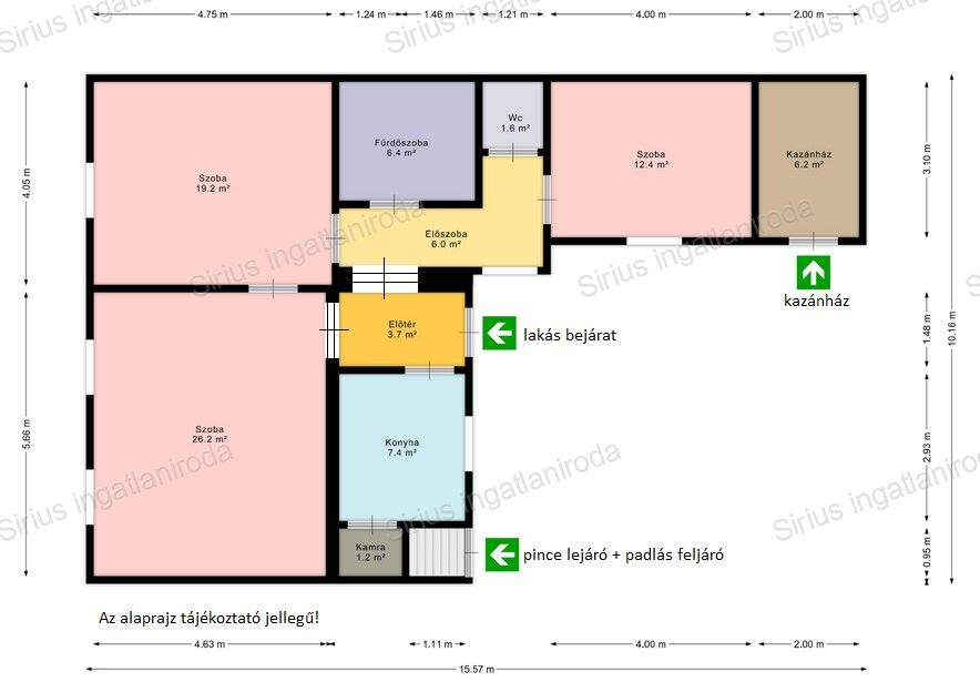 A lakáshoz tartozik egy teljes egészében saját tulajdonú pince, valamint padlástér, amelyhez szorgalmi utat kell biztosítani a szomszéd részére.