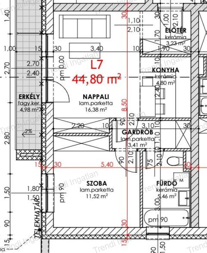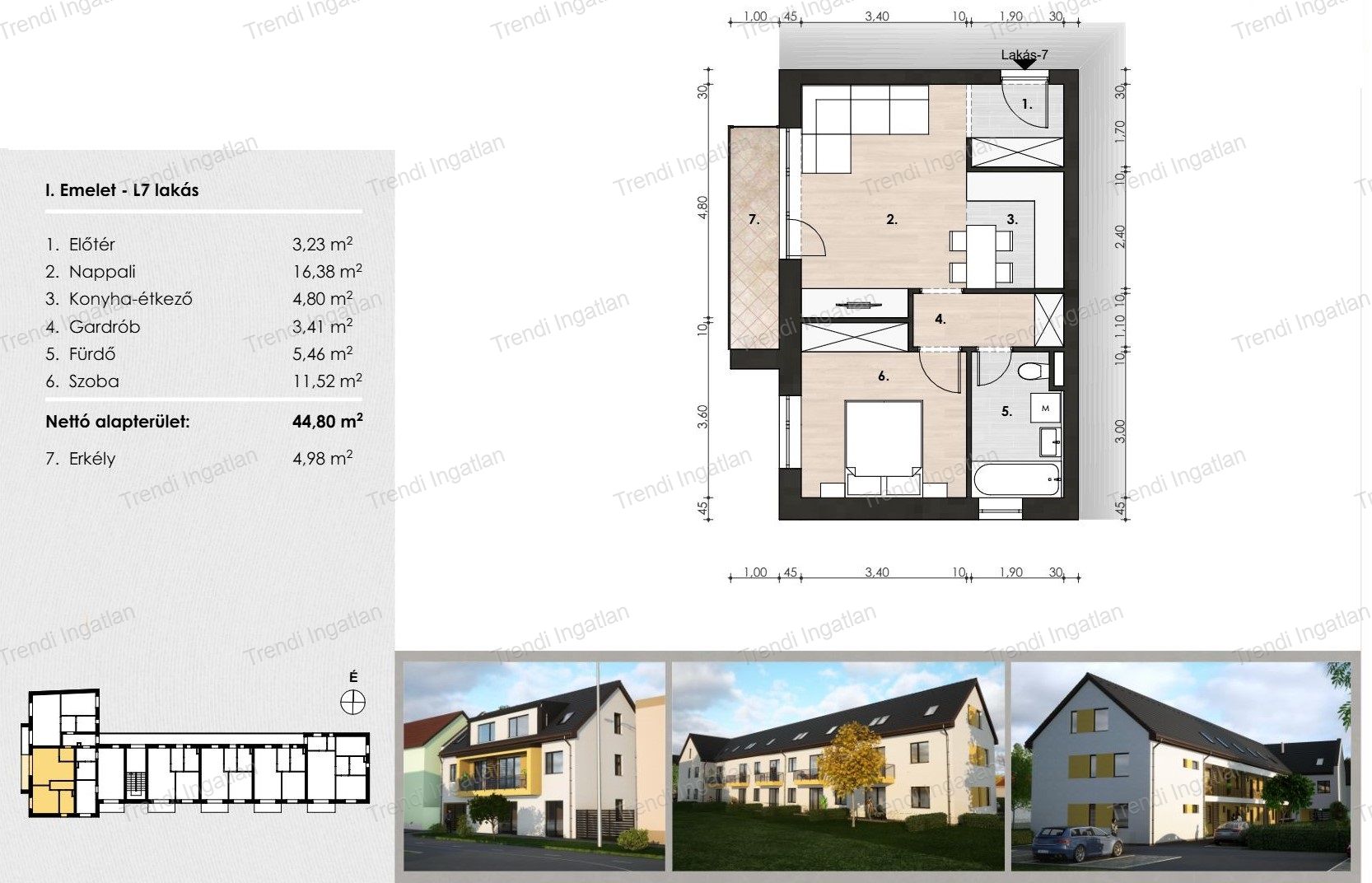 A meghirdetett 1. emeleten található 44,80 nm-es ingatlanban amerikai konyhás nappali, szoba, fürdőszoba, gardrób, előtér kerül kialakításra. A nappaliból 4,98 nm-es erkély nyílik.