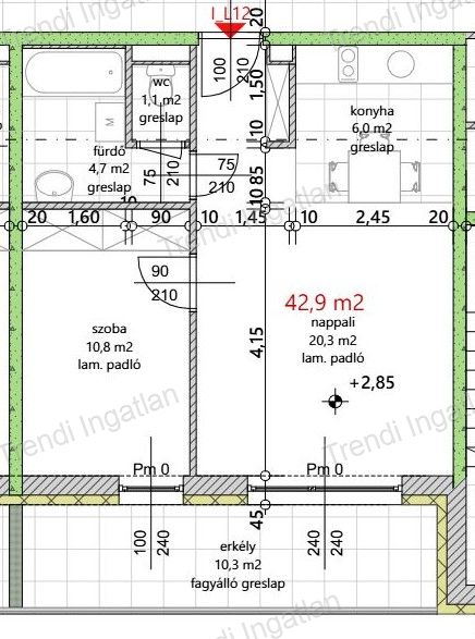 A meghirdetett 1. emeleten található 42,90 nm-es lakásban amerikai konyhás nappali, szoba, fürdőszoba, külön WC, előtér kerül kialakításra. Nappaliból 10,30 nm-es erkély nyílik.