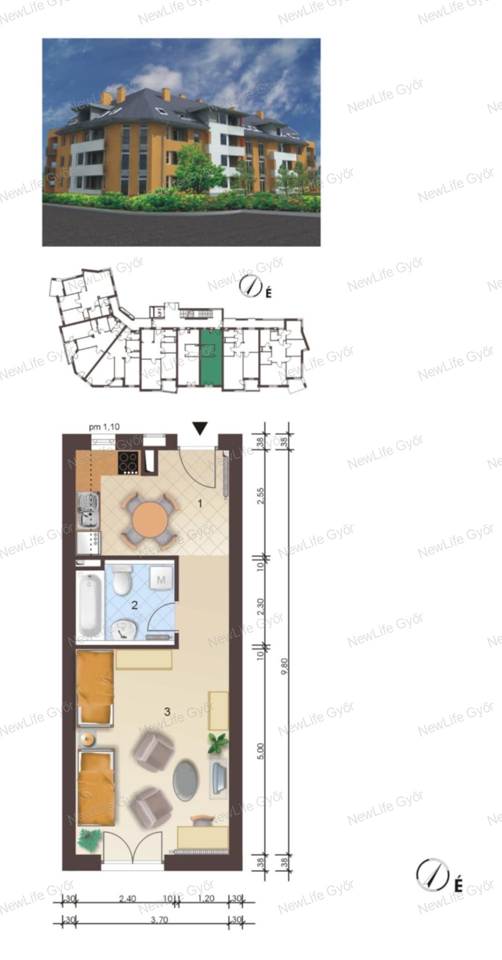 Elosztása konyha+étkezőből, szobából, közlekedőből és fürdőszobából áll.