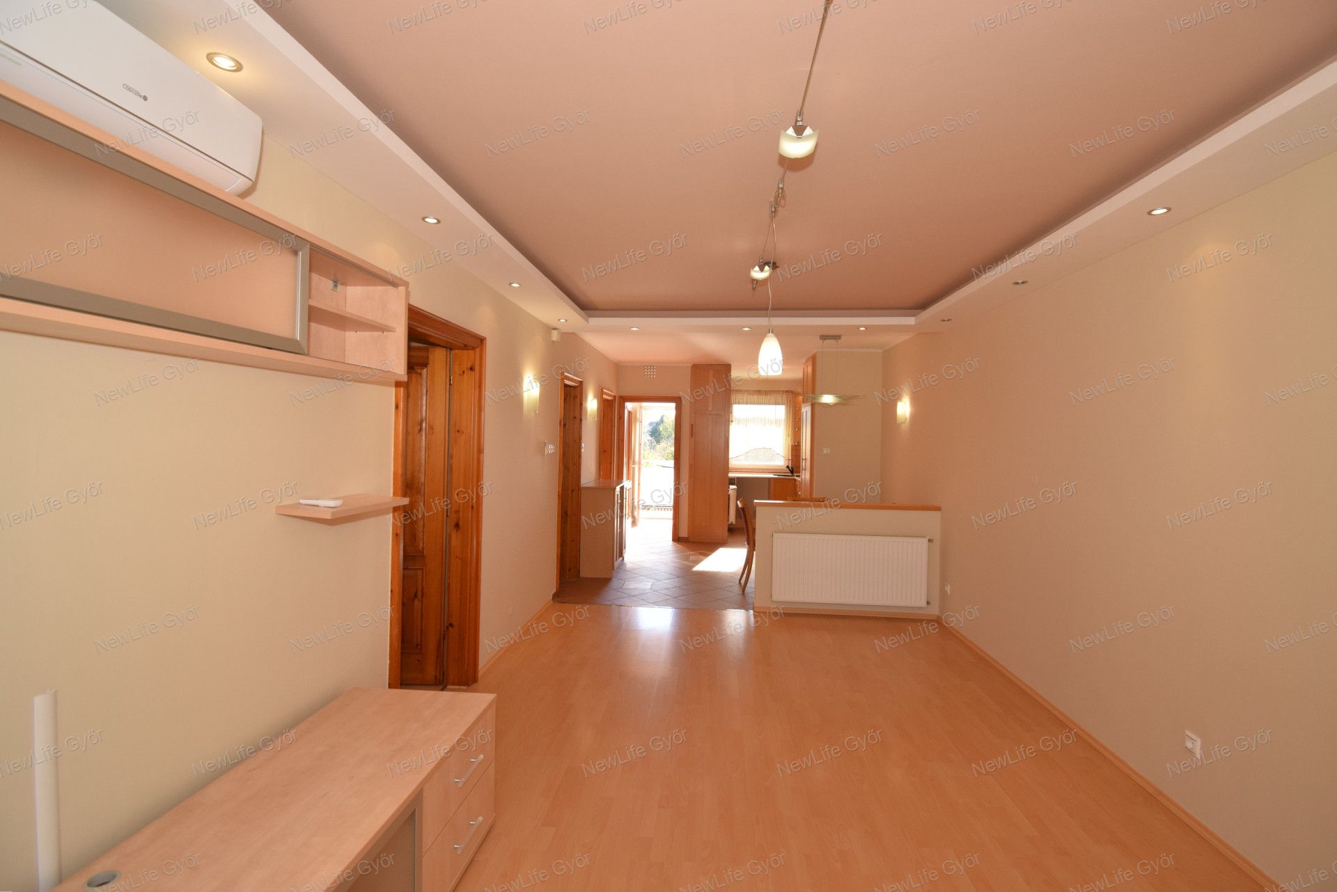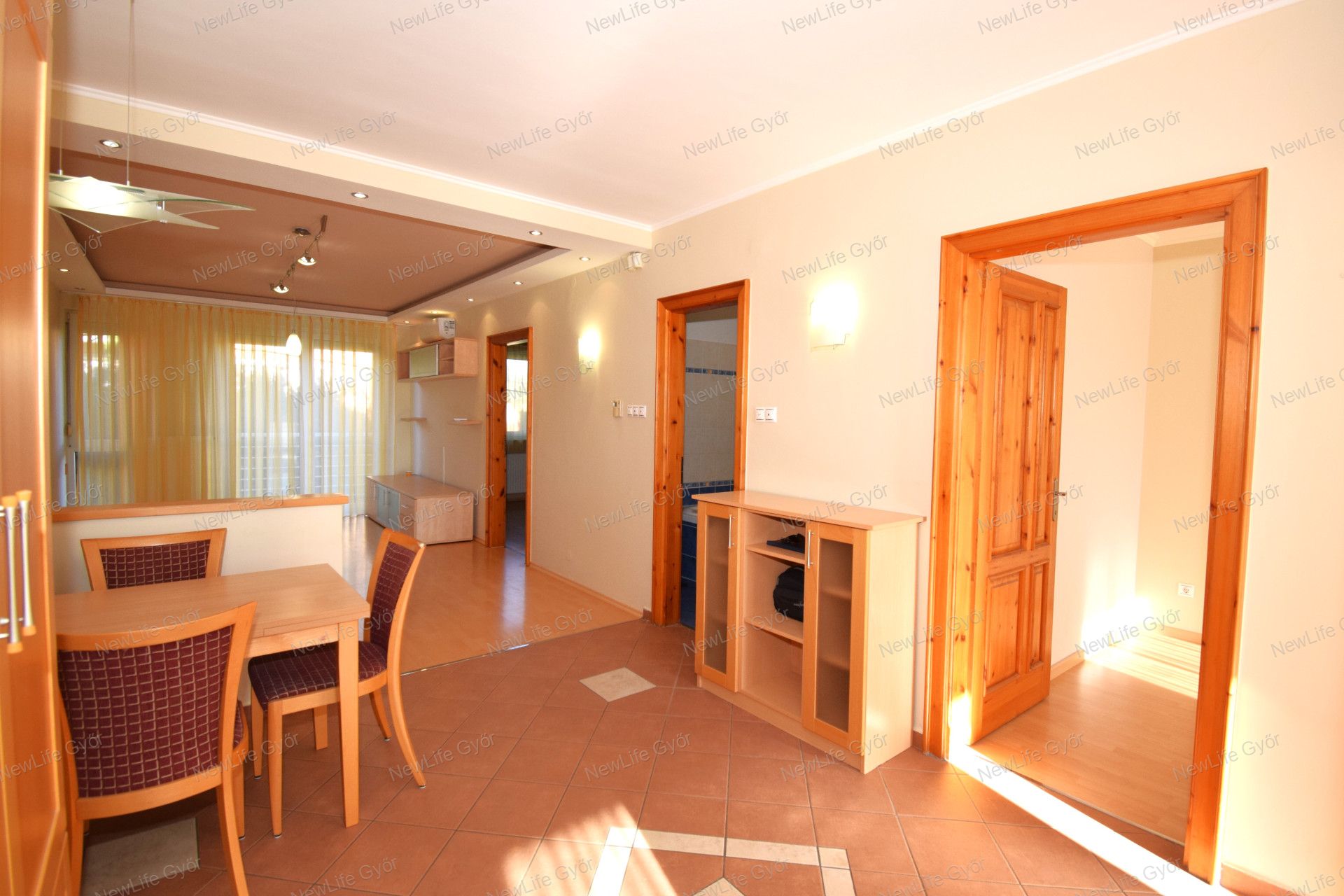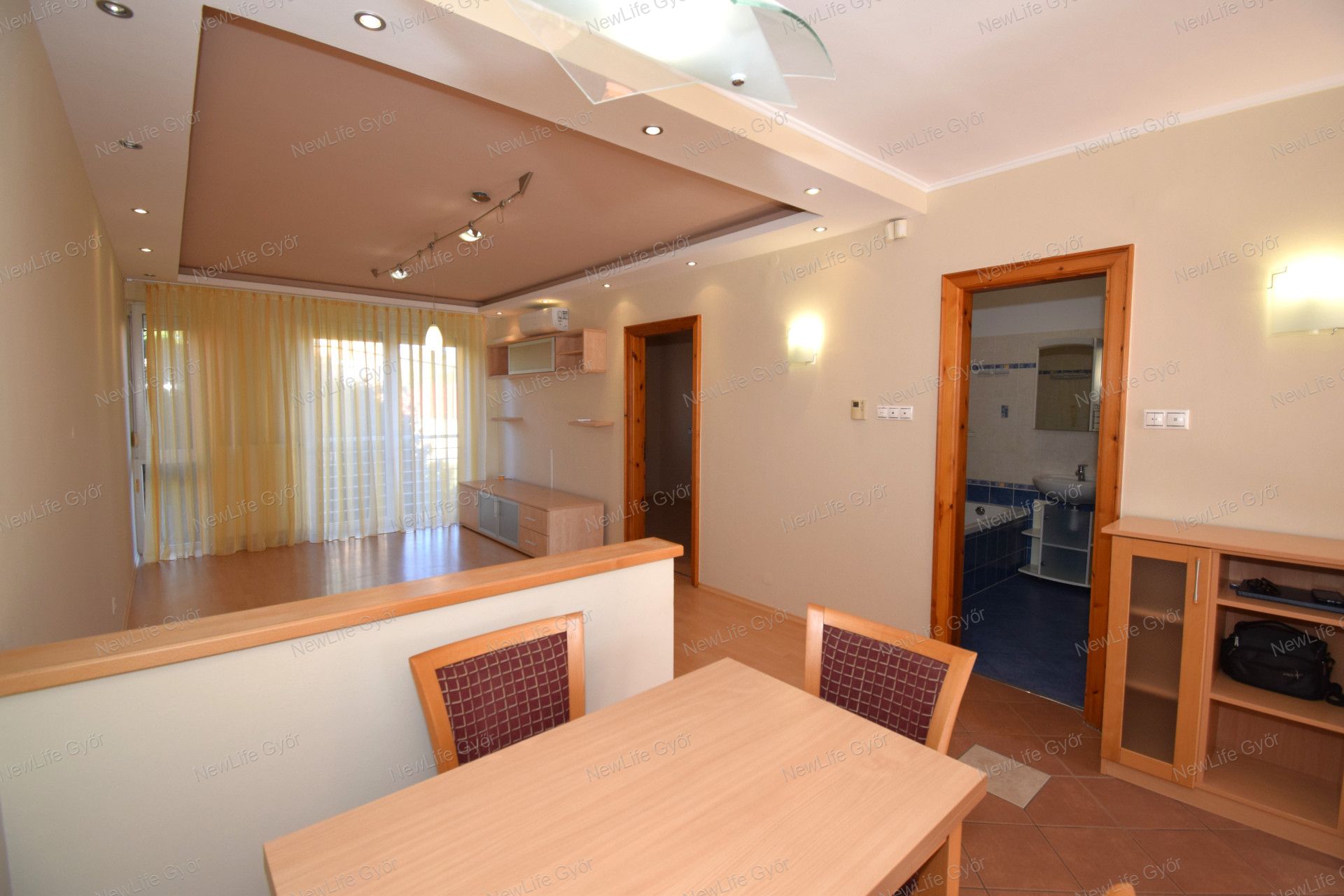 Elosztása: előszoba, konyha étkezővel, nappali, fürdőszoba zuhanyzóval, káddal és WC-vel és két hálószoba. Az egyik hálószobában és az előszobában is nagy beépített szekrények segítik a tárolást. A lakás vételár része a fotókon látható nappali bútor és komód. Nappali fölött álmennyezet látható beépített spotlámpákkal.