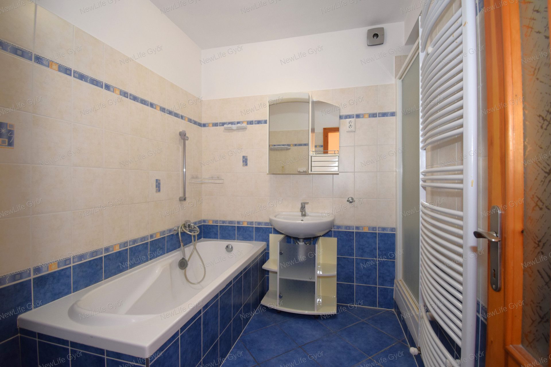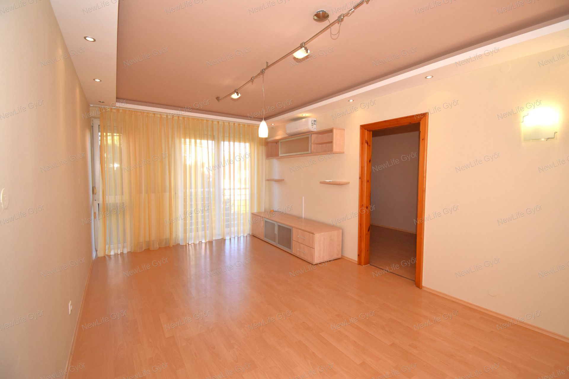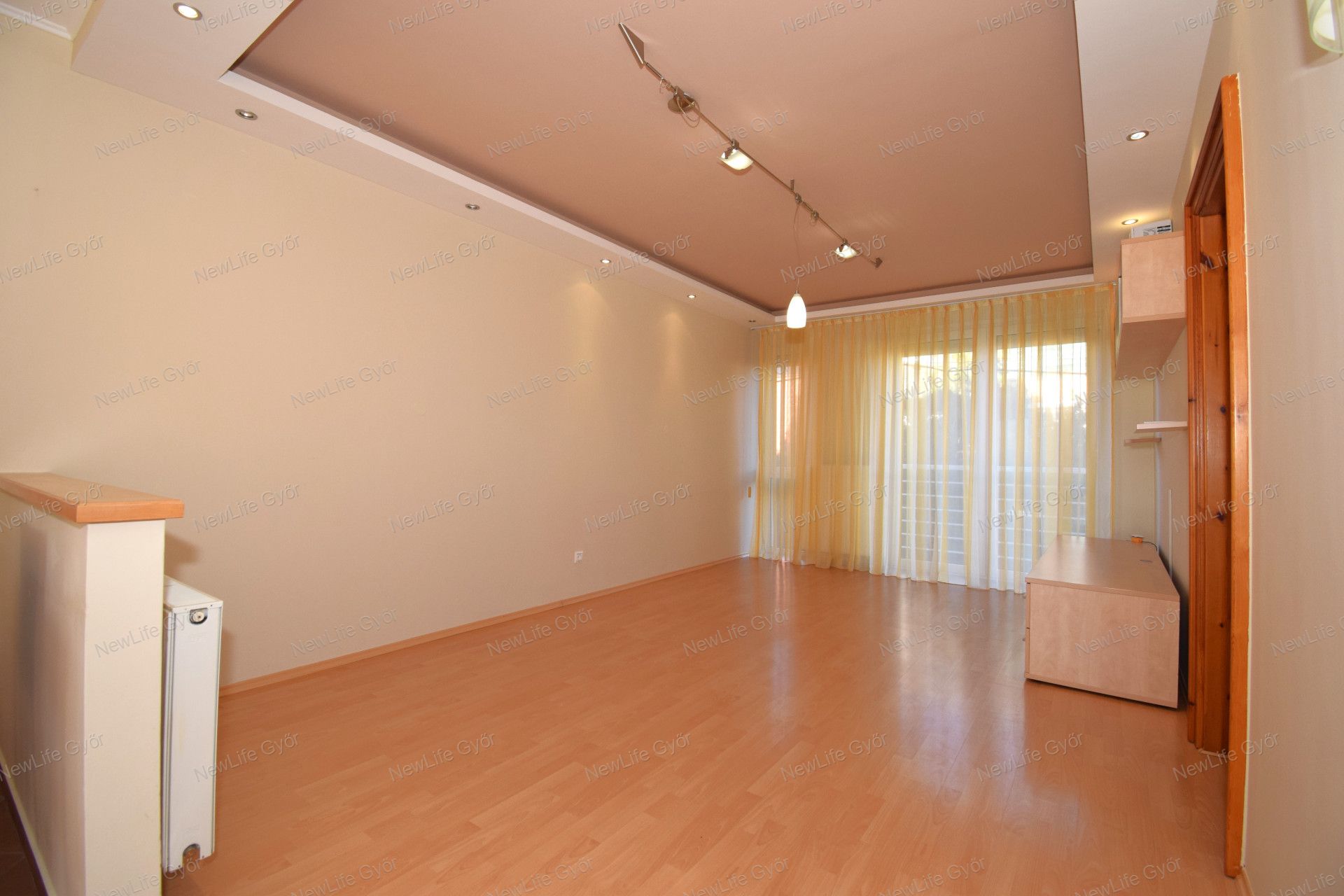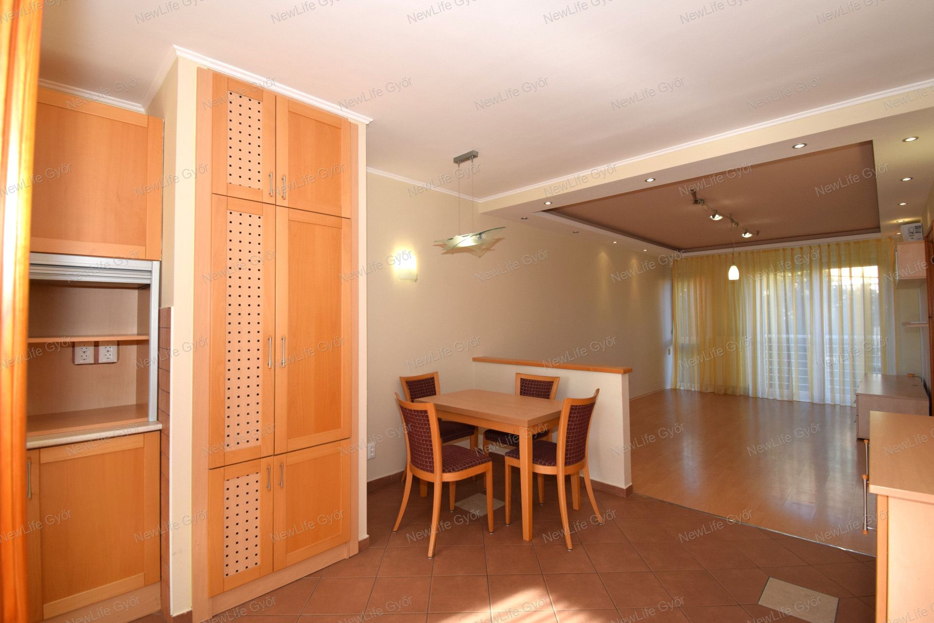 Elosztása: előszoba, konyha étkezővel, nappali, fürdőszoba zuhanyzóval, káddal és WC-vel és két hálószoba. Az egyik hálószobában és az előszobában is nagy beépített szekrények segítik a tárolást. A lakás vételár része a fotókon látható nappali bútor és komód. Nappali fölött álmennyezet látható beépített spotlámpákkal.