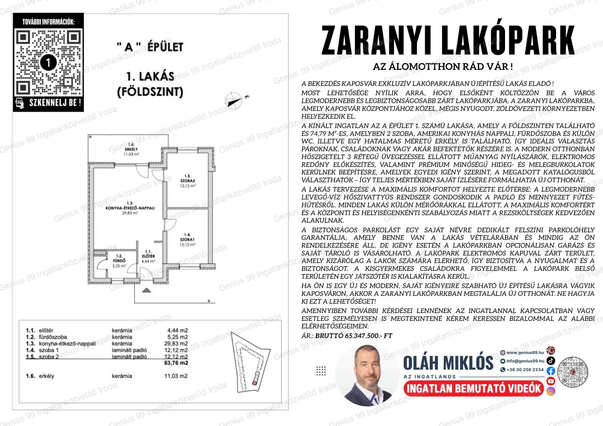 A kínált ingatlan az A épület 1. számú lakása, amely a földszinten található és 74,79 m²-es, amelyben 2 szoba, amerikai konyhás nappali, fürdőszoba és külön WC, illetve egy hatalmas méretű erkély is található, így ideális választás pároknak, családoknak vagy akár befektetők részére is. A modern otthonban hőszigetelt 3 rétegű üvegezéssel ellátott műanyag nyílászárók, elektromos redőny előkészítés, valamint prémium minőségű hideg- és melegburkolatok kerülnek beépítésre, amelyek egyedi igény szerint, a megadott katalógusból választhatók – így teljes mértékben saját ízlésére formálhatja új otthonát.