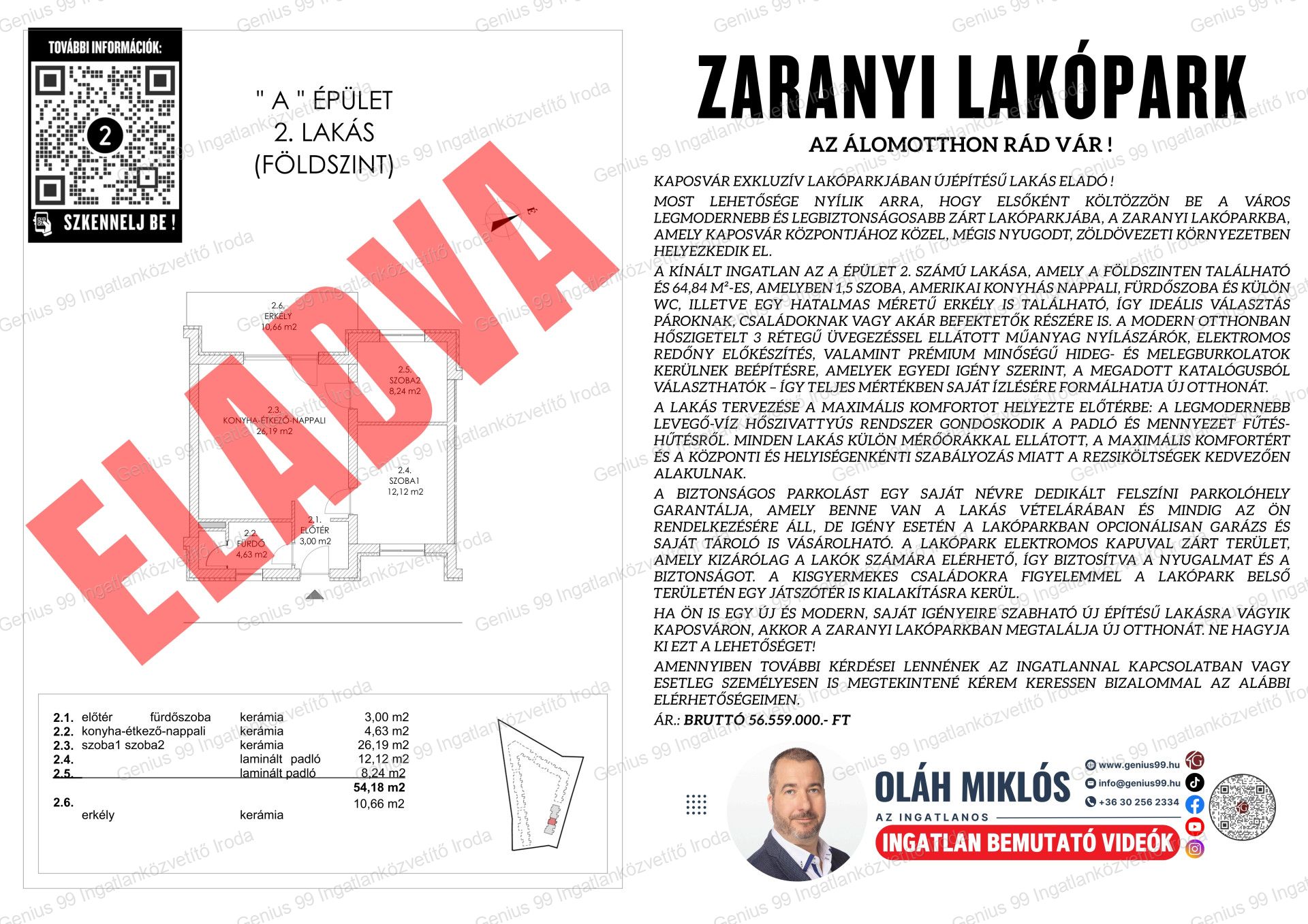 Most lehetősége nyílik arra, hogy elsőként költözzön be a város legmodernebb és legbiztonságosabb zárt lakóparkjába, a Zaranyi lakóparkba, amely Kaposvár központjához közel, mégis nyugodt, zöldövezeti környezetben helyezkedik el.