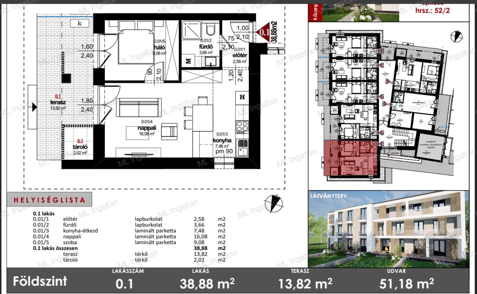 Nappali + 1 szoba + 2 m2 tároló + 8 m2 terasz