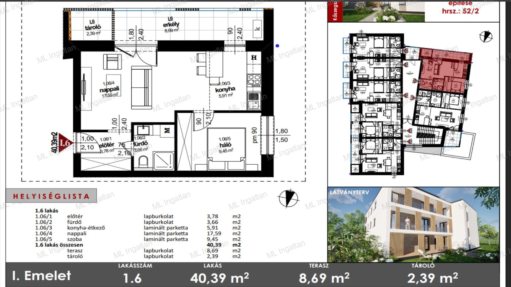 Nappali + 1 szoba + 2 m2 tároló + 8 m2 terasz