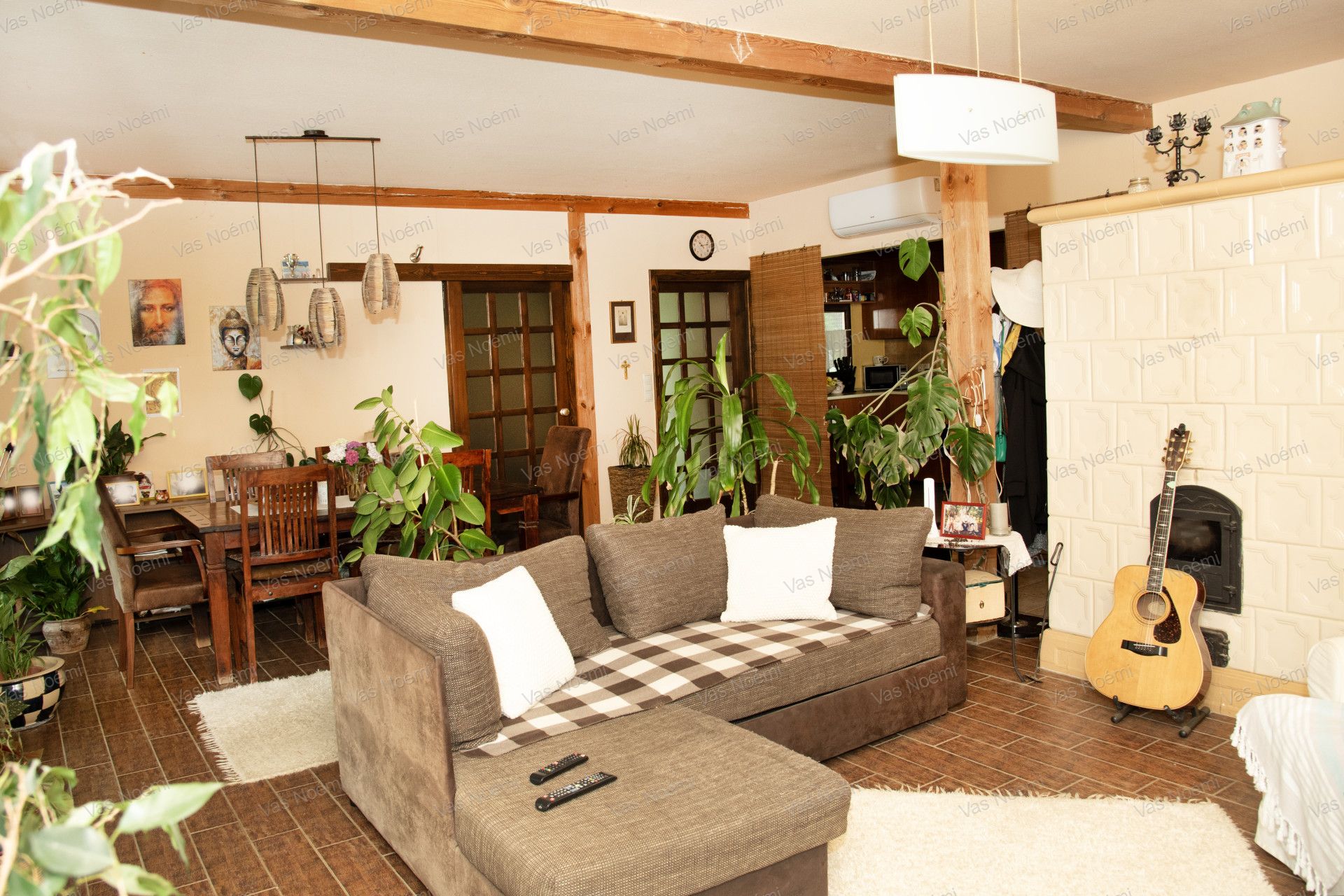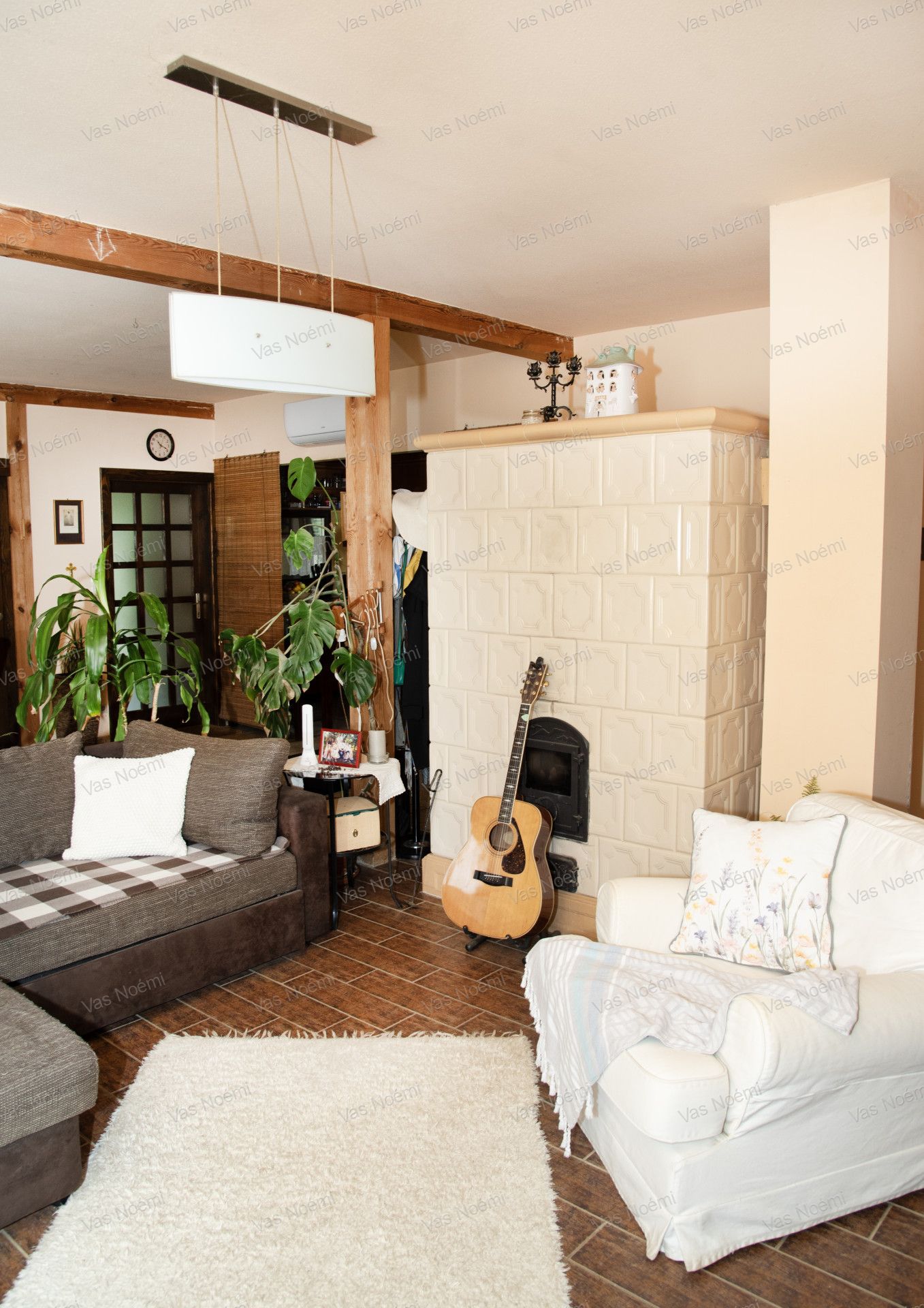 A nappali központi részén elhelyezett cserépkályha kényelmesen befűti az egész házat