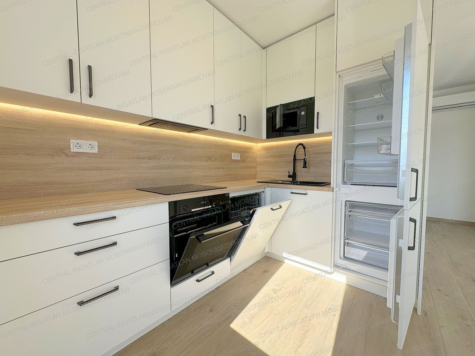 -A konyhabútor minden géppel felszerelt (kombi hűtő, mosogatógép, mikró, sütő, főzőlap, páraelszívó). A gépek Bosch márkájúak. A csaptelep flexibilis, kihúzható a maximális kényelem biztosítására.
