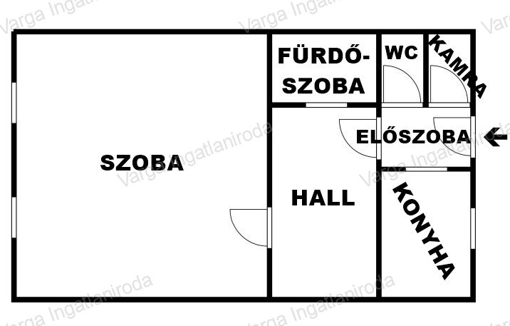 - helyiségei: 1 szoba, konyha-étkező, hall, fürdőszoba, WC, kamra, előszoba