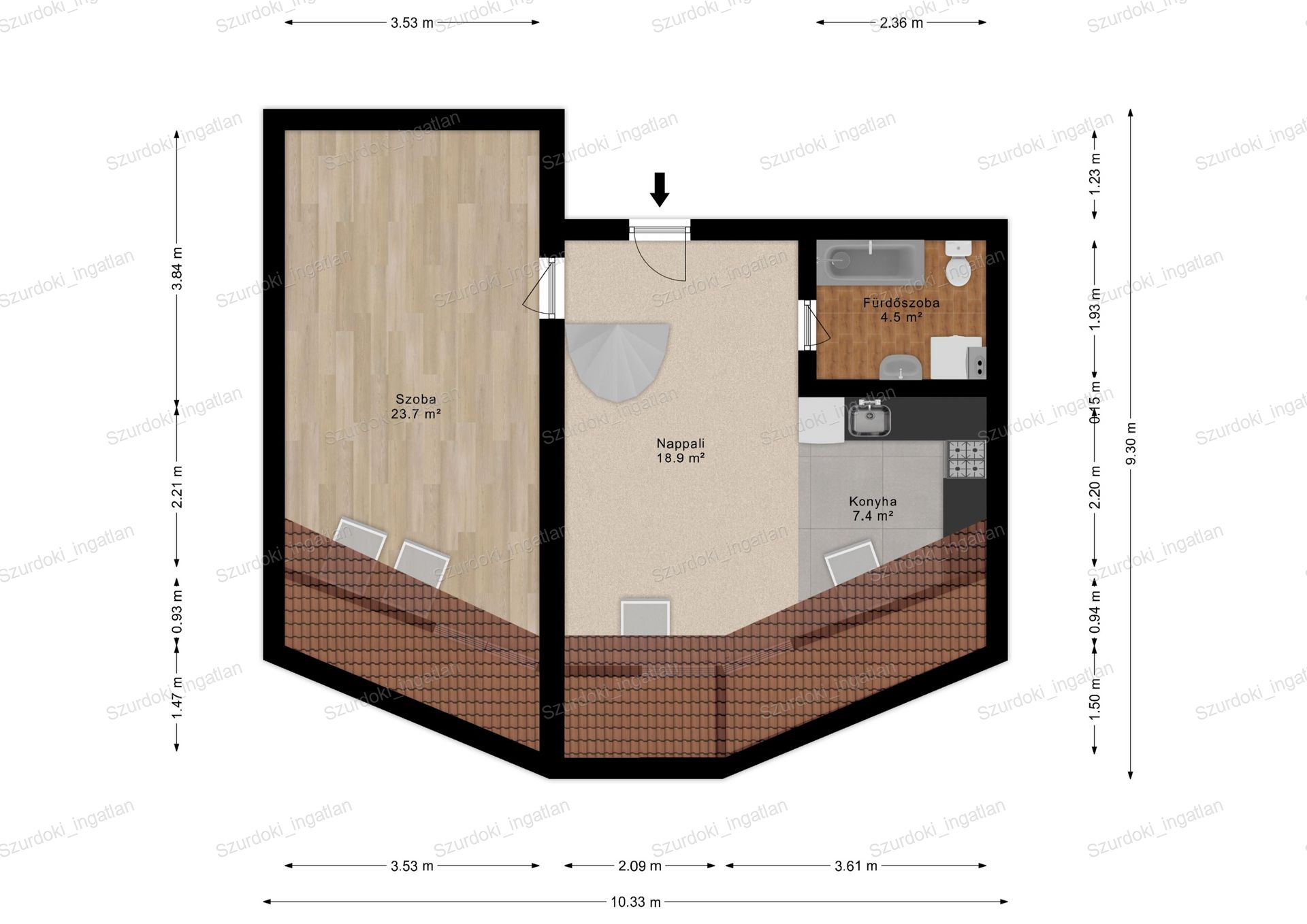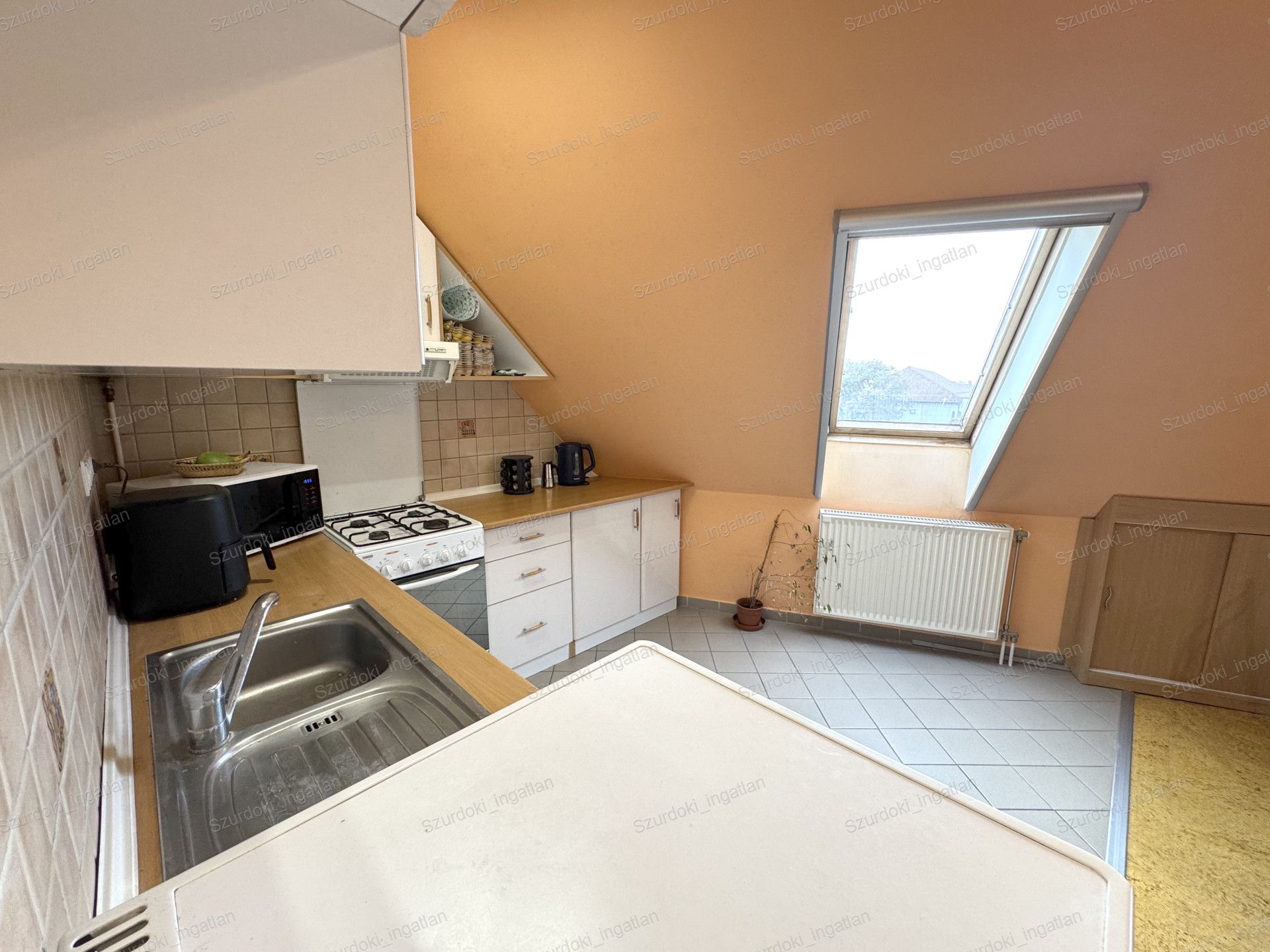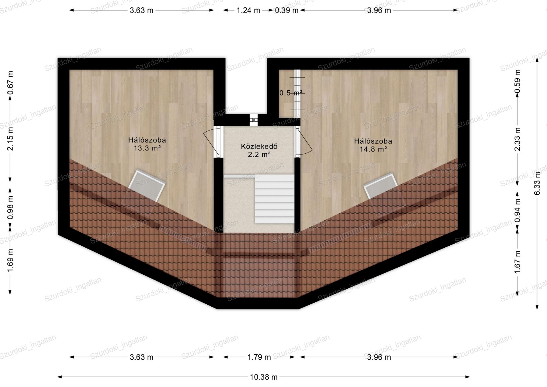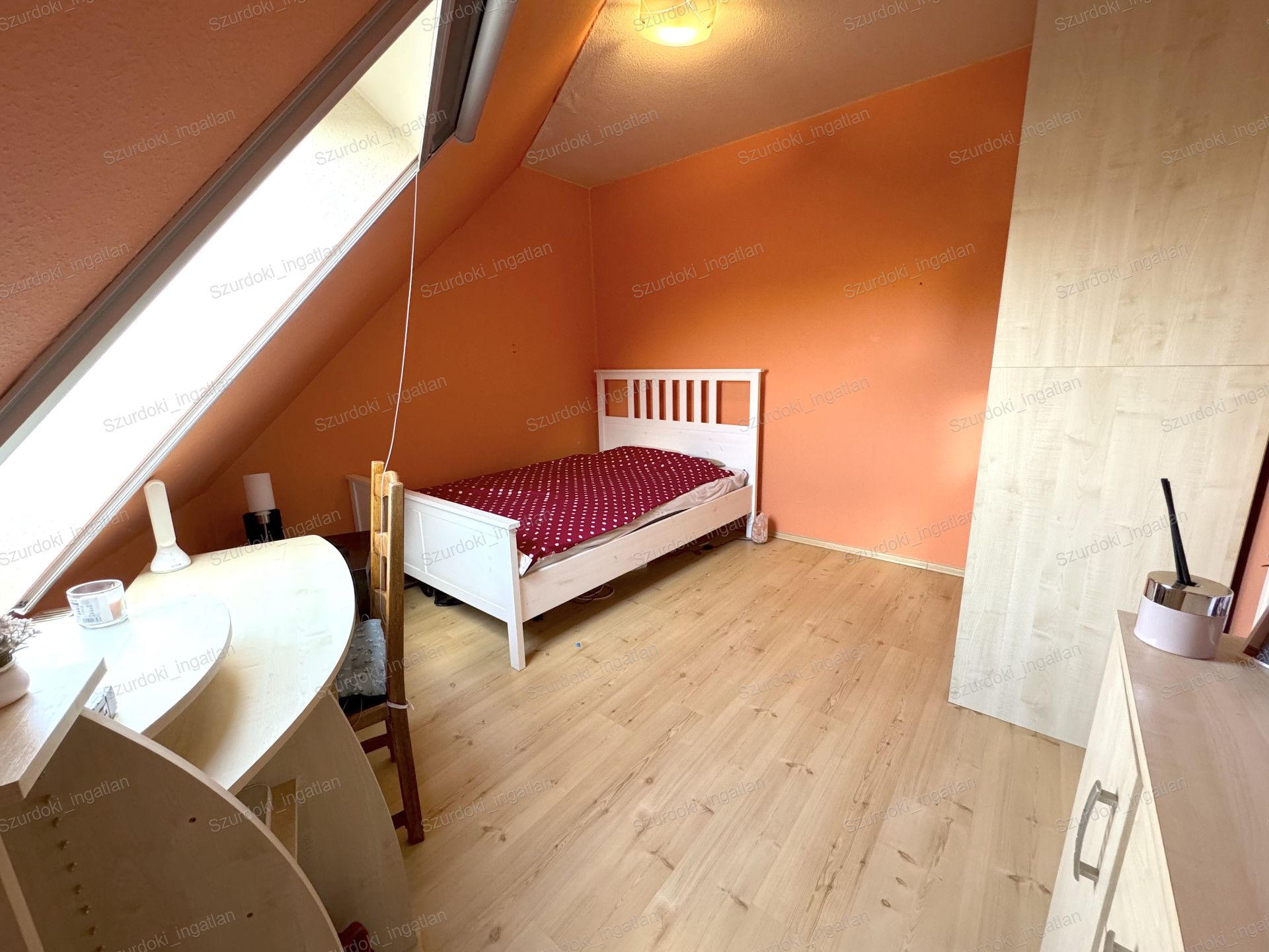 Nyílászárók: dupla üvegezéssel ellátott Velux ablakok, fényzáró rolóval ellátva