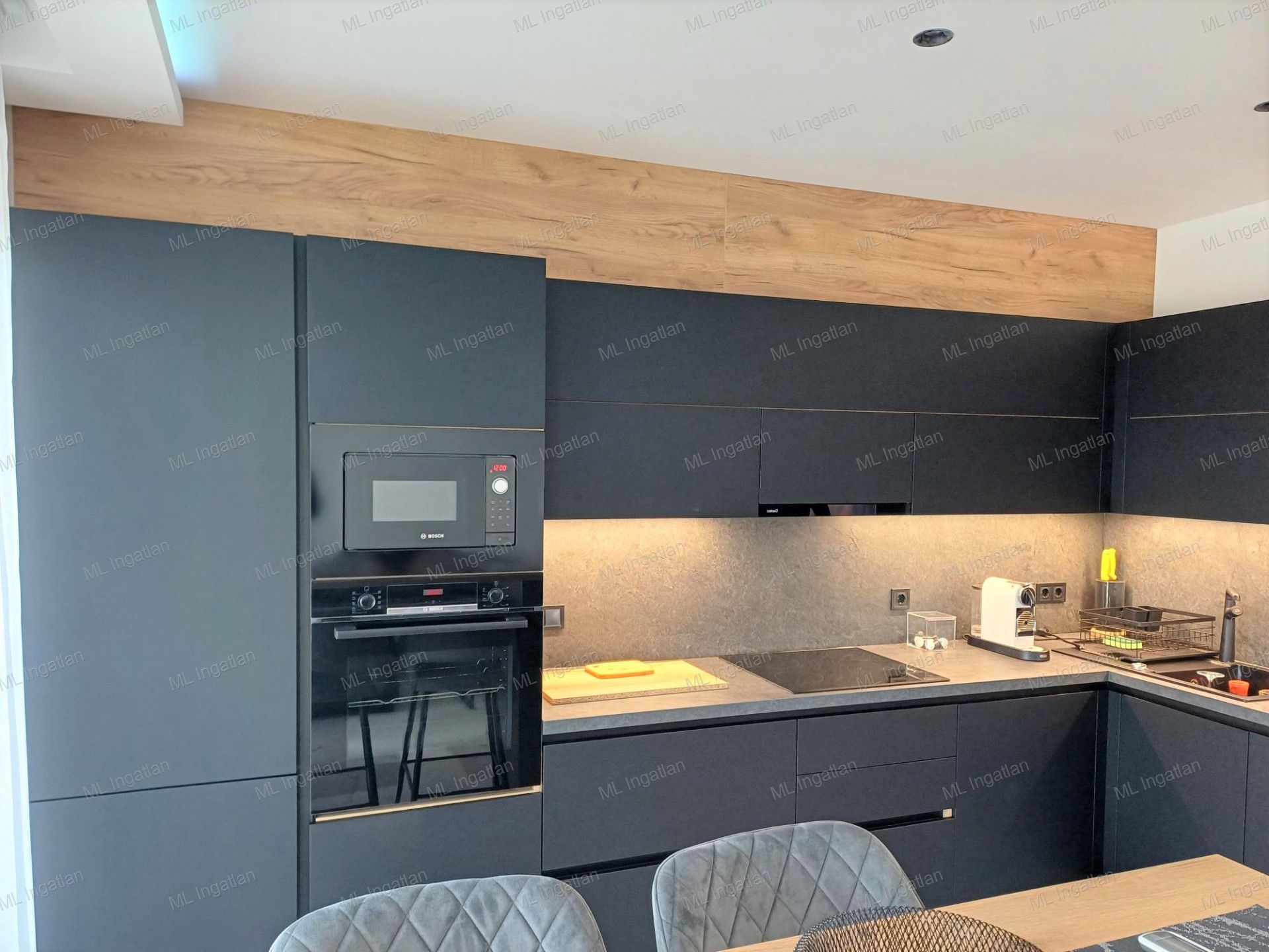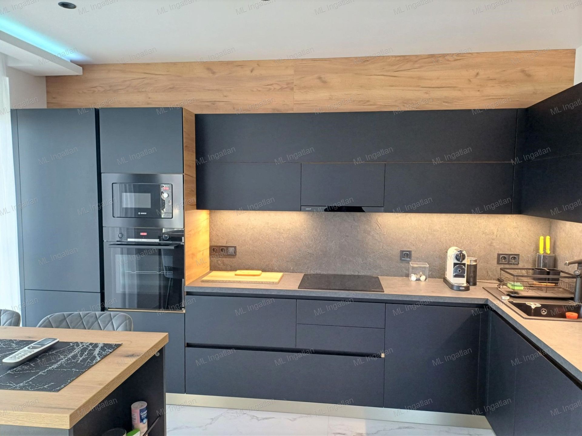 A konyhabútor egyedi tervezésű és kivitelezésű, magasfényű fronttal, prémium vasalatokkal és prémium beépített gépekkel készült. (mosogató, mosógép, sütő-főzőlap, elszívó).