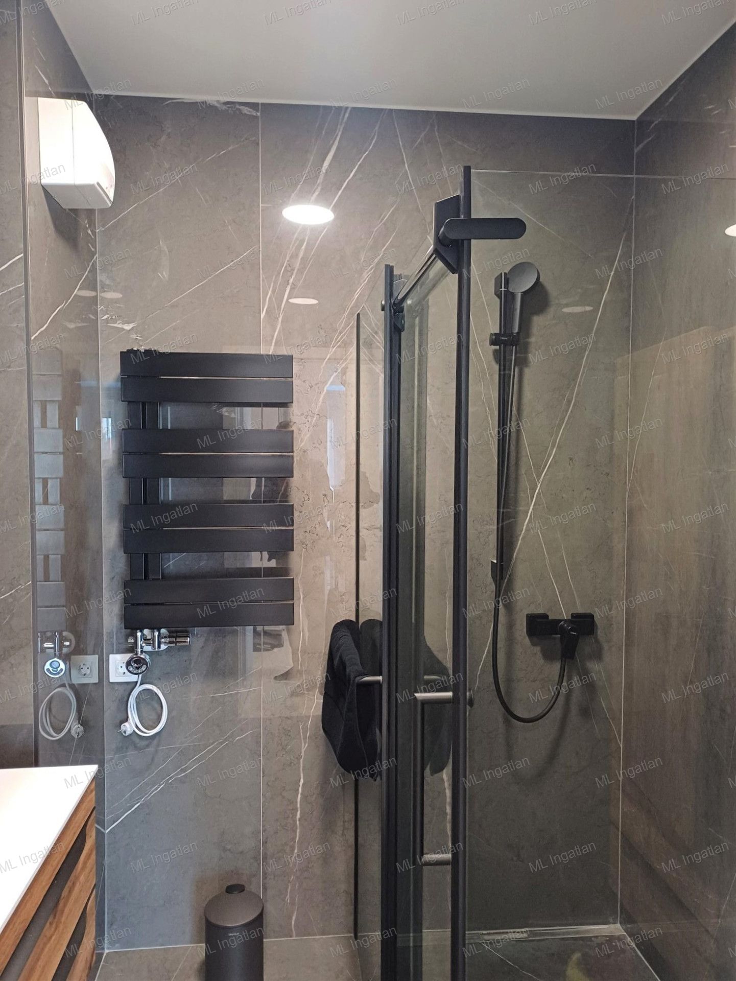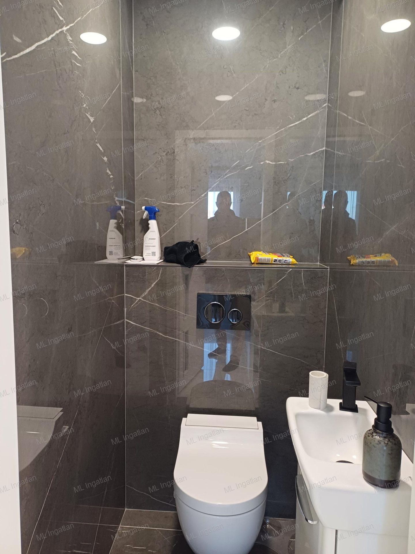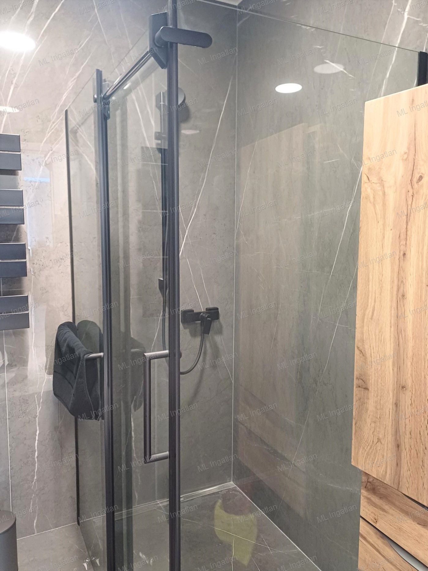 A fürdőszobába egyedileg gyártott burkolatokat építettek be. (2 méter hosszú lapokból készült a zuhanyzó. A fugákat így szinte teljesen kizárták). Hansgrohe szanitereket választott a tulajdonos, szintén prémium minőségben.