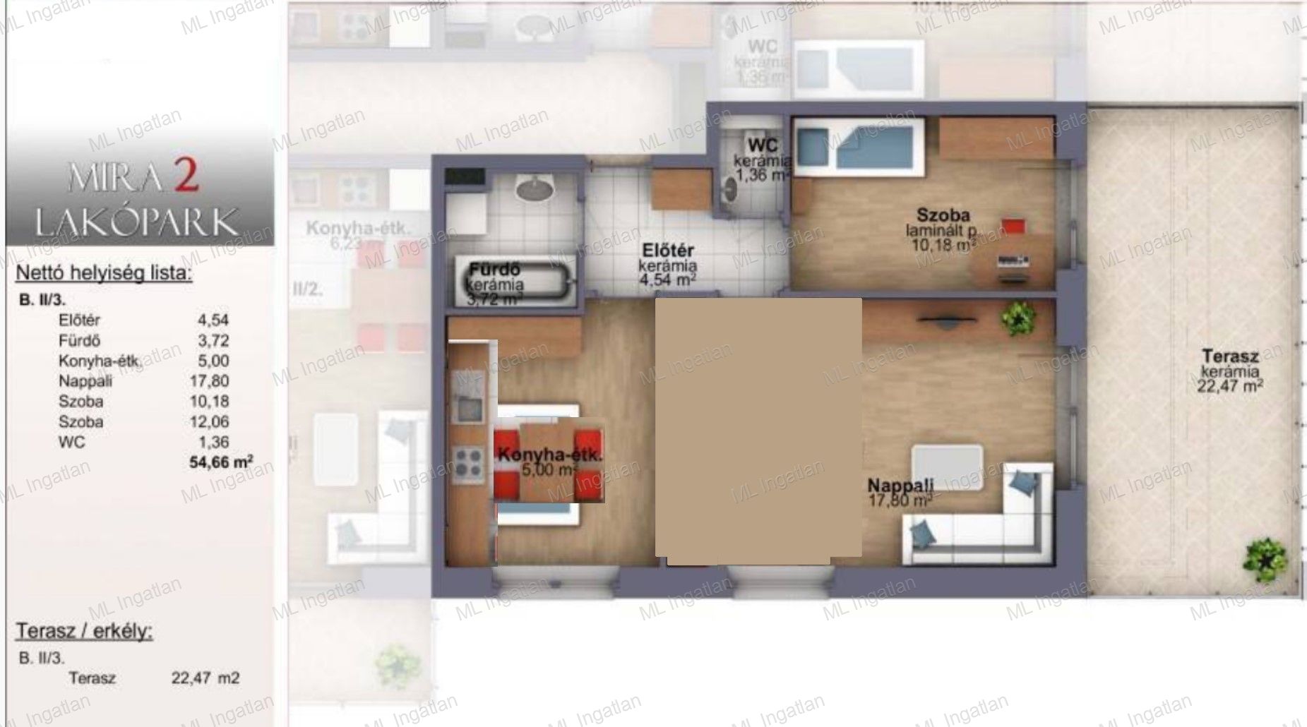 A remek elrendezésű, kis alapterületű lakás befektetésnek, illetve első lakáshoz jutó fiataloknak kiváló választás. A remek tervezői munkának köszönhetően vált 55 nm–es + 22 m2 nagyteraszos alapterületű lakássá.