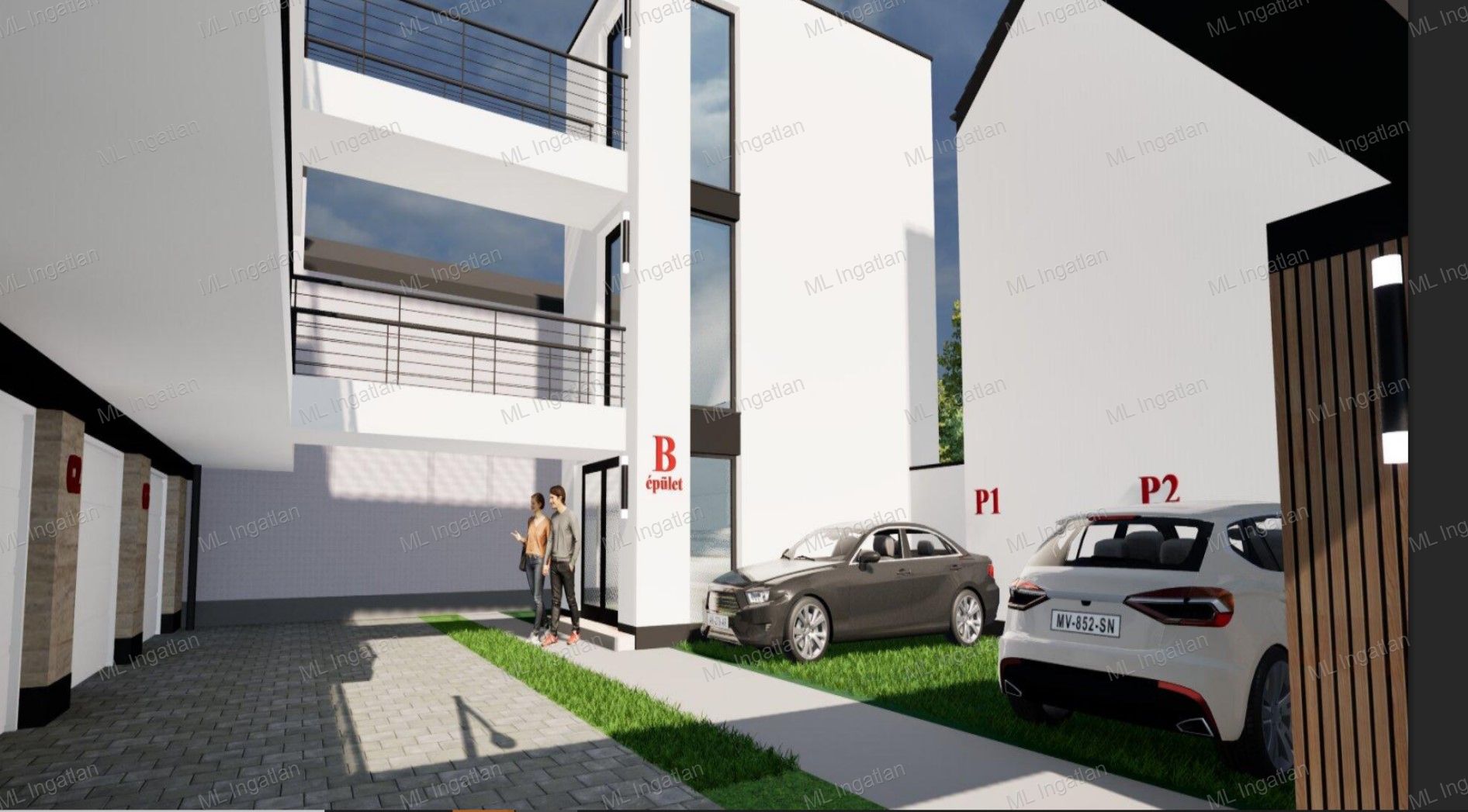 Az épület kettő szintes lesz. A földszinten 4 darab garázs is vásárolható, illetve a belső udvaron lesznek kialakítva a parkolók is.