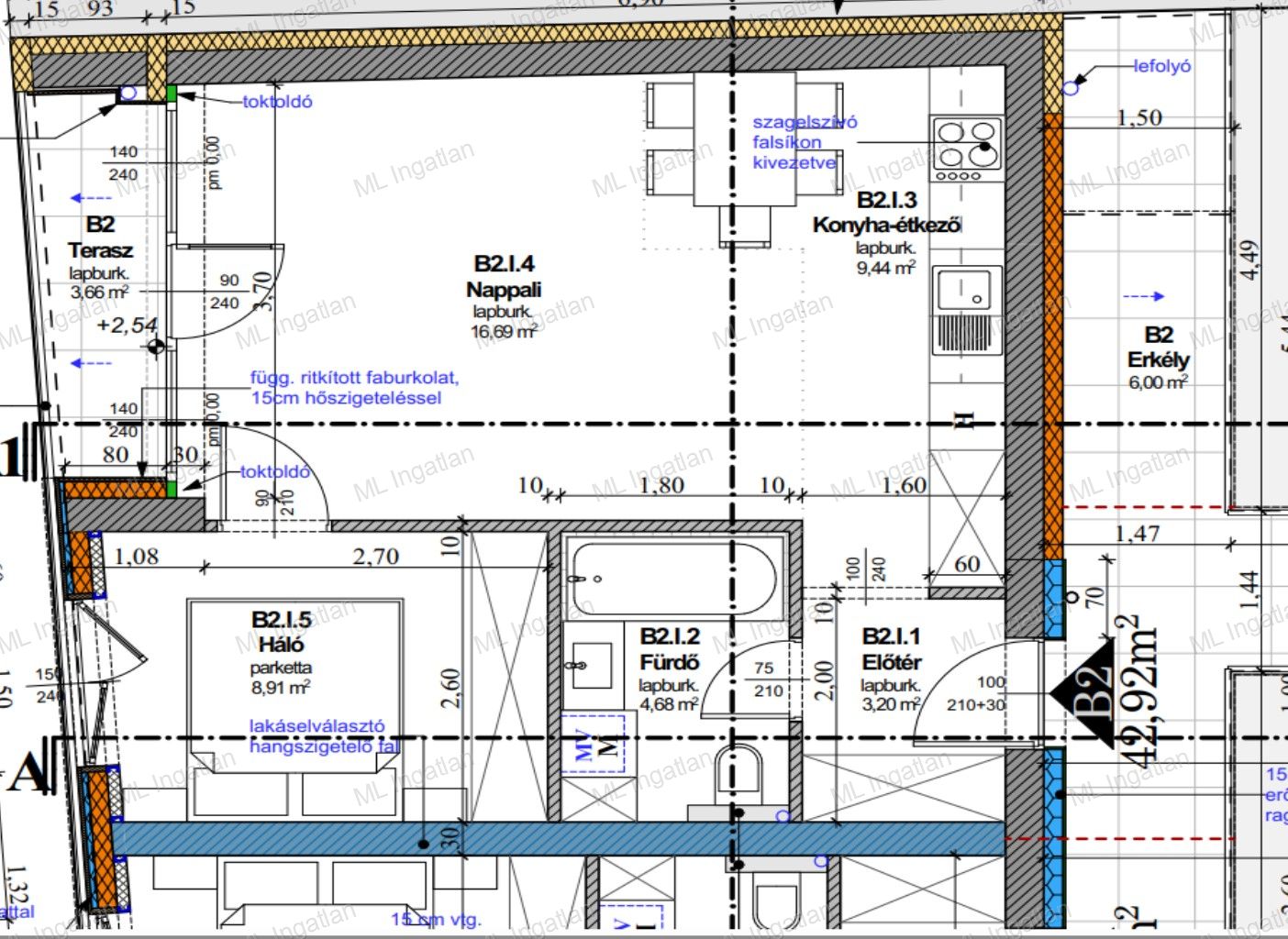 Téglaszerkezetű falazat, külső 15 cm-es hőszigeteléssel.