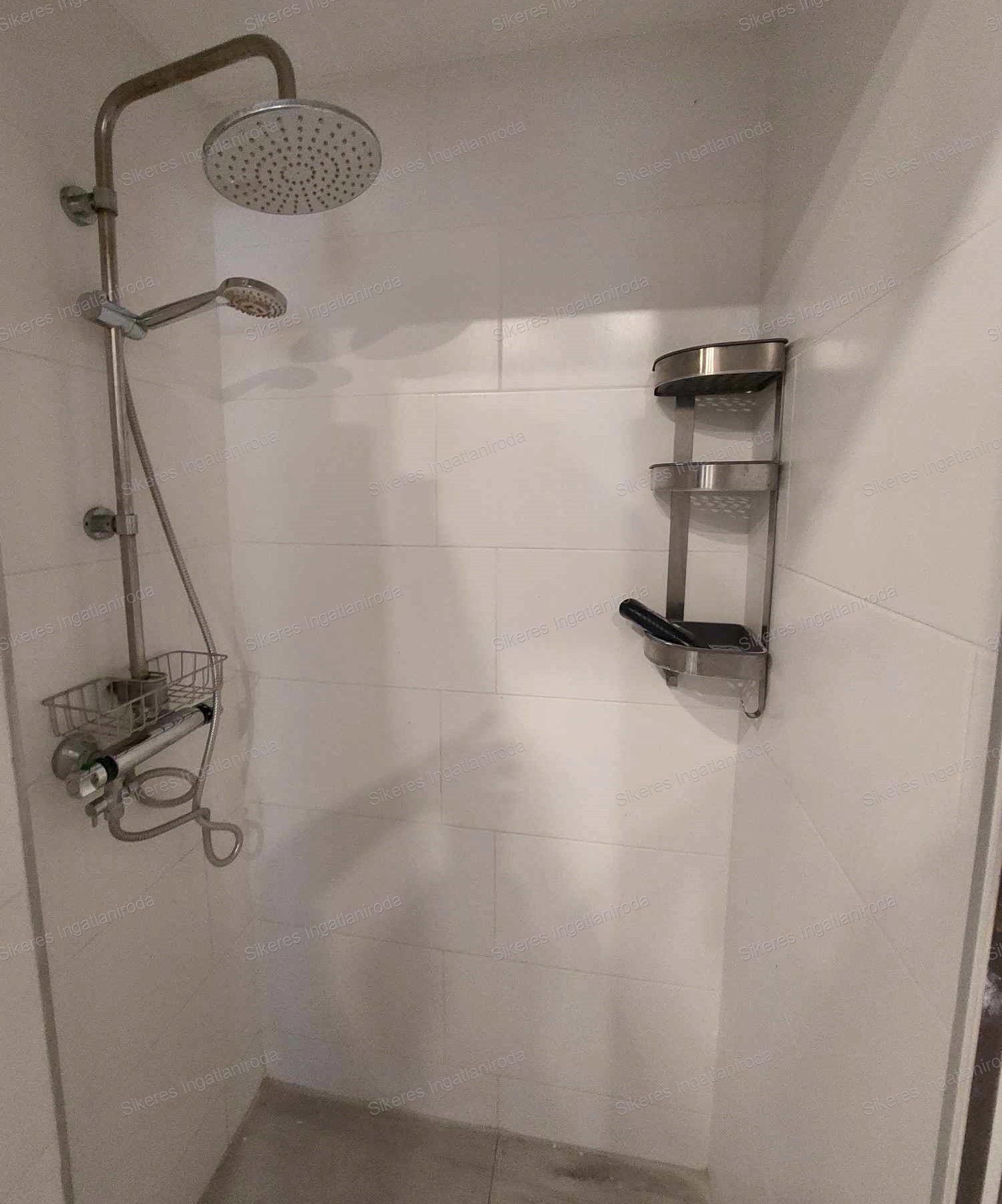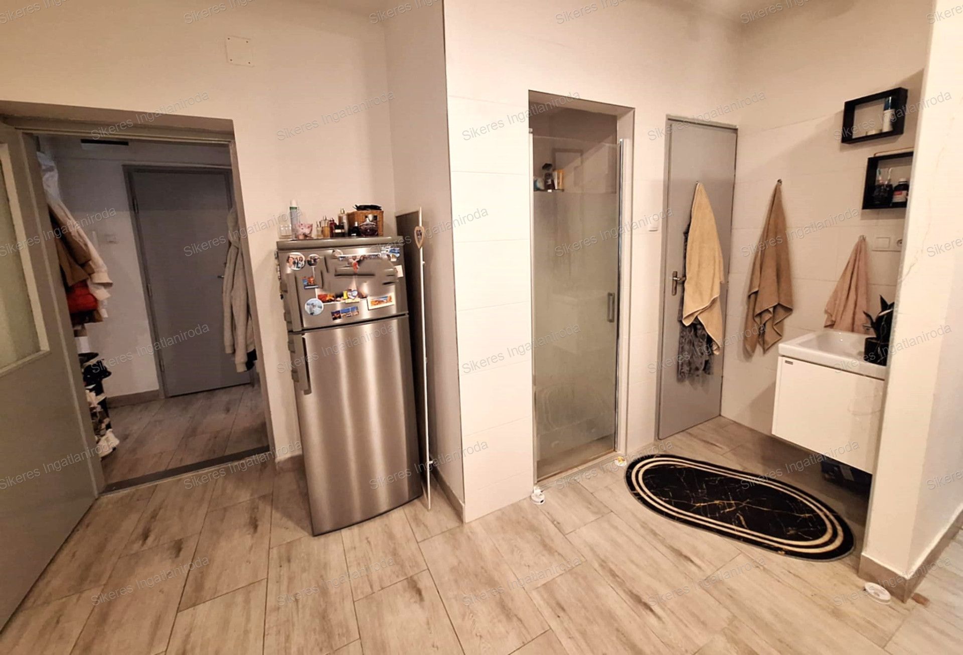 Az eladó lakás elrendezése átgondolt, a közlekedőből jobbra nyíló, tágas konyhához egy külön rész kapcsolódik, ahol zuhanyzó, mellékhelyiség és kézmosó került kialakításra.