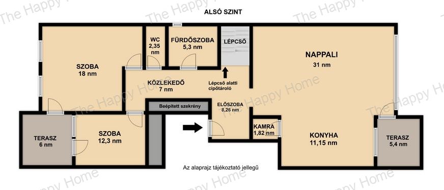 Az alsó szinten található (107 m²):