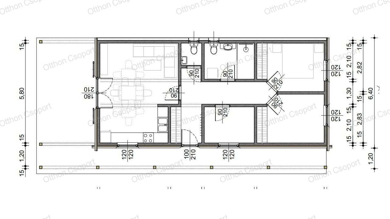 Jó a ház elosztása is, tágasak a terek. Konyha-nappali-étkezőt, 3 hálószobát, 2 WC-t és egy fürdőszobát látunk épített zuhannyal.
