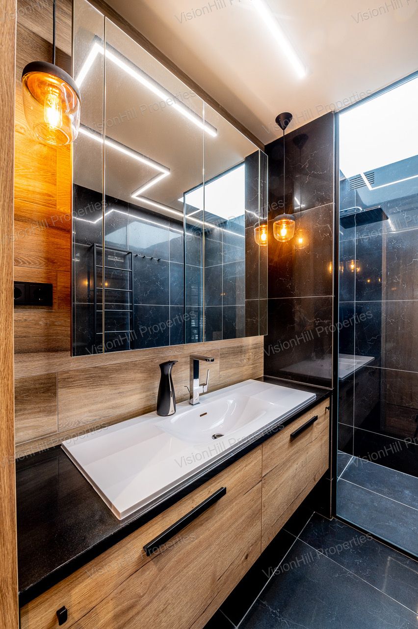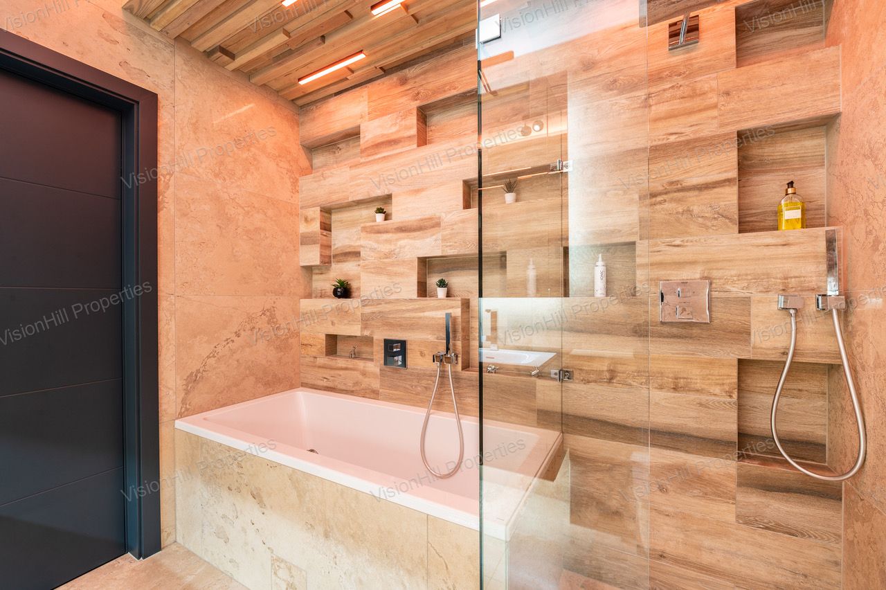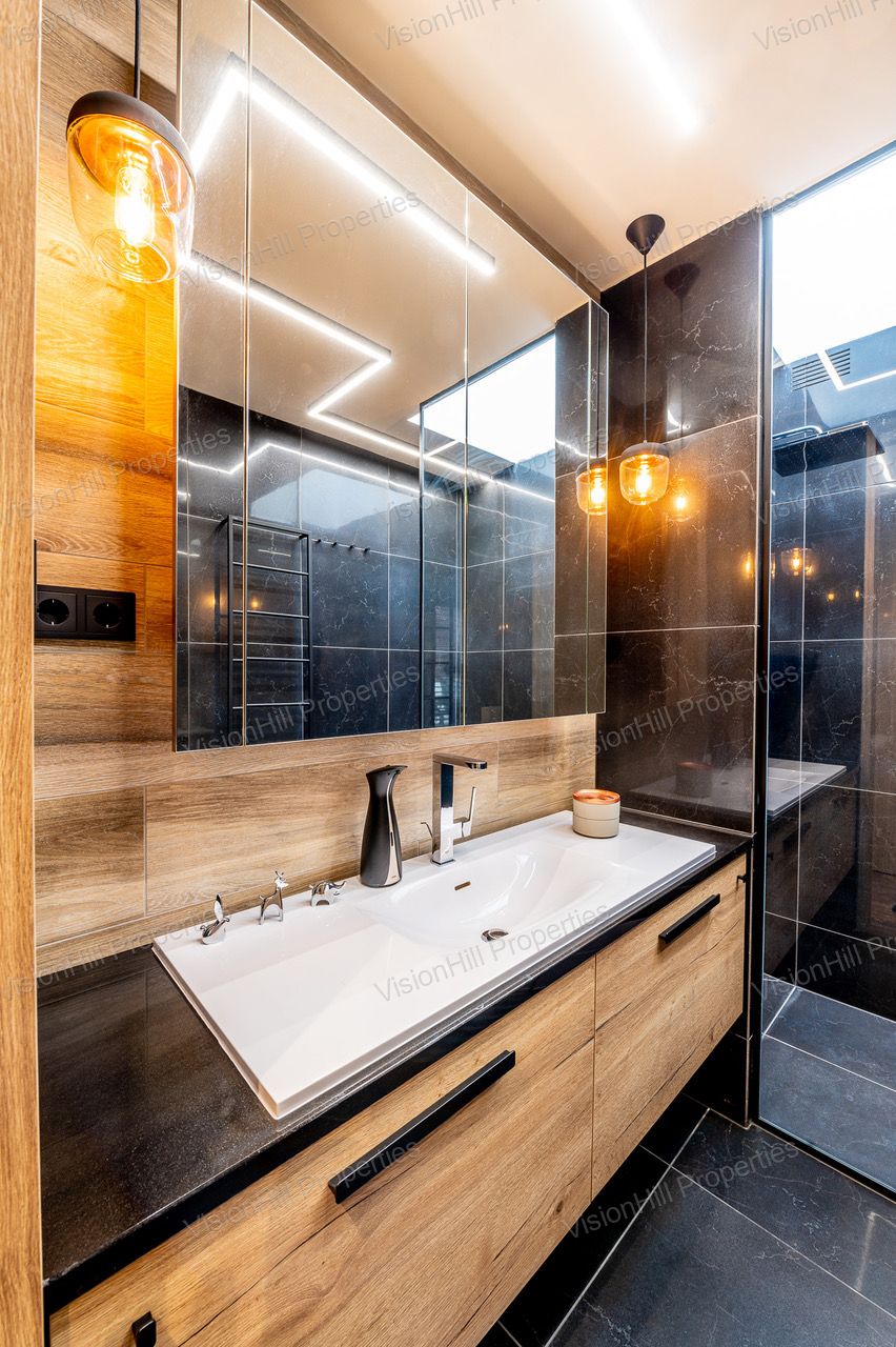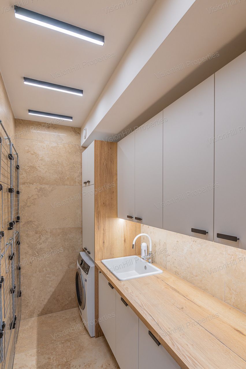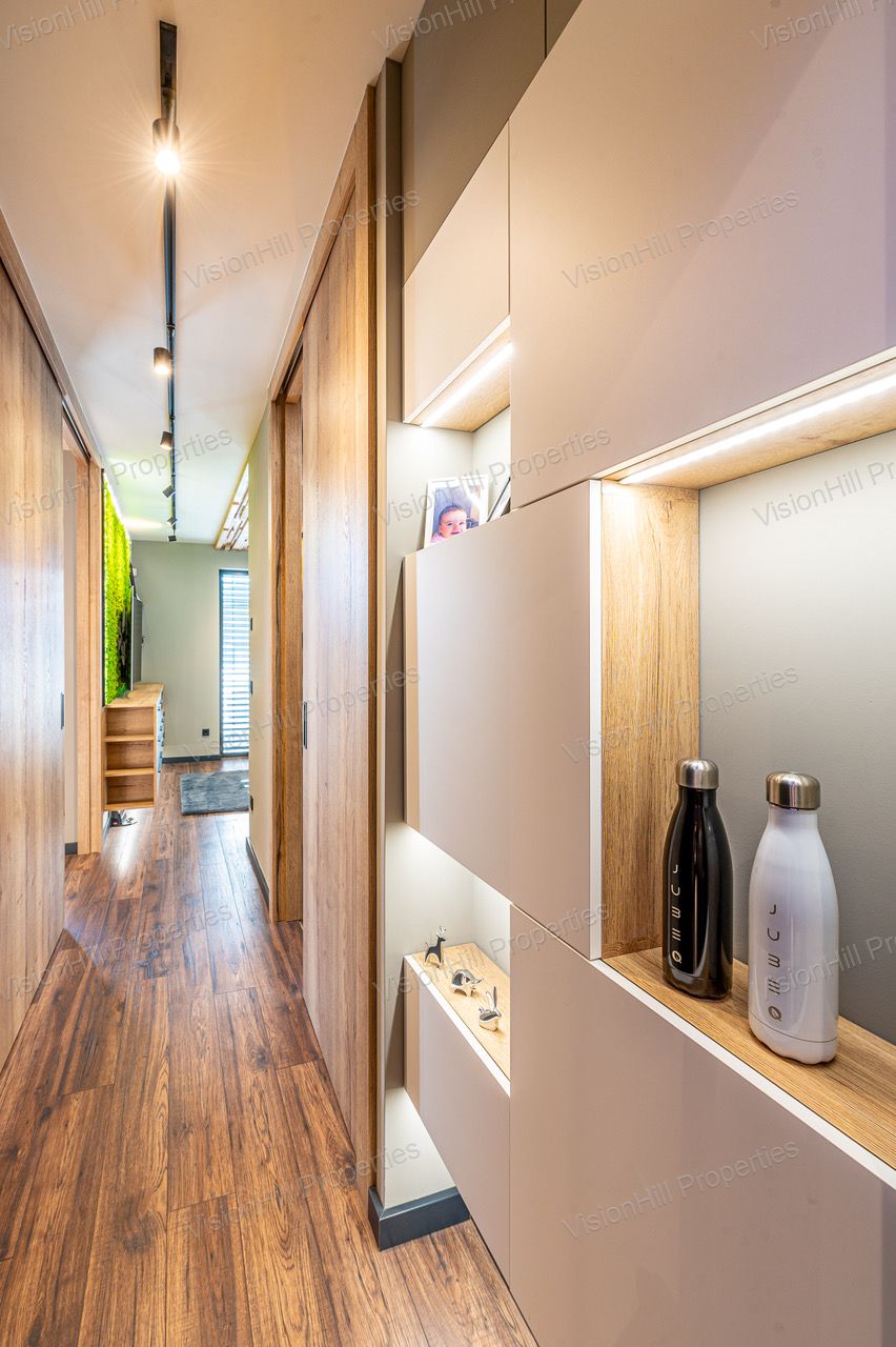 -Egyedileg gyártott, prémium beépített bútorok, gránit munkalapok, fémvázas szekrények, izlandi zuzmó falpanelek, fa lamellák a nappaliban, folyosón, fürdőszobában, hálószobában